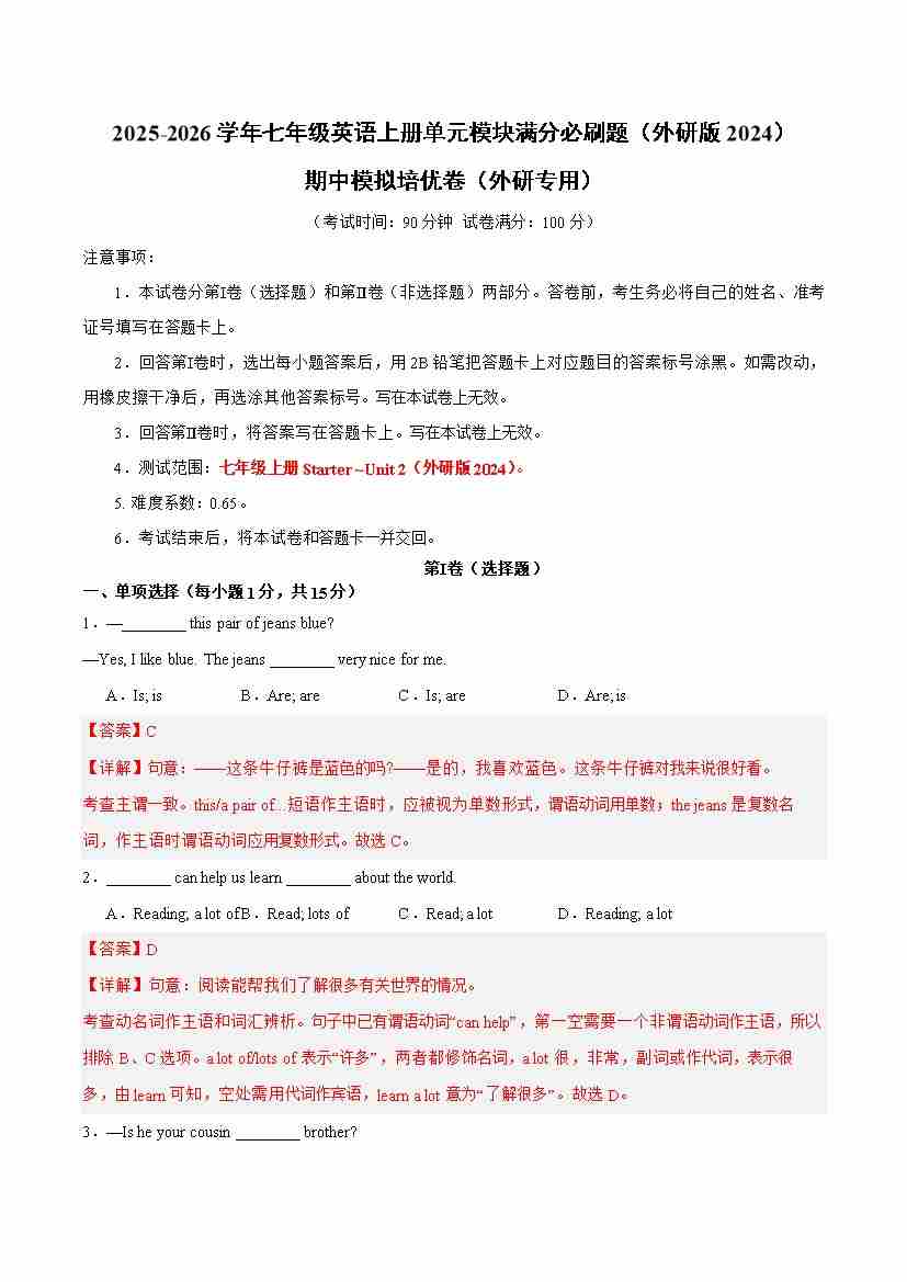 期中模拟培优卷(外研专用)(教师版)(外研版2024)