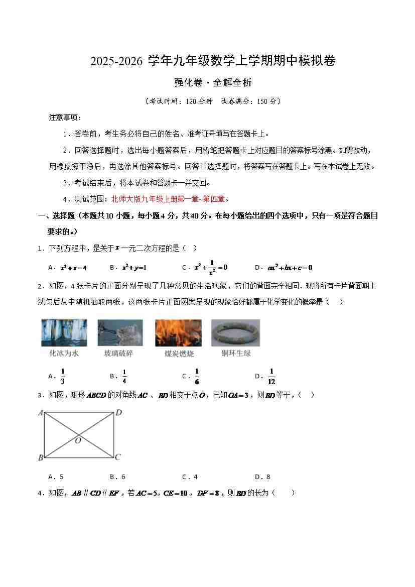 九年级数学上学期期中模拟卷(北师大版1~4章,高效培优强化卷)(考试版A4)