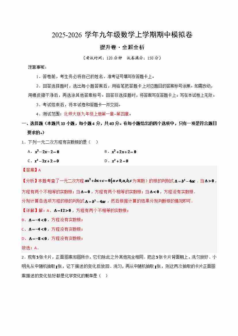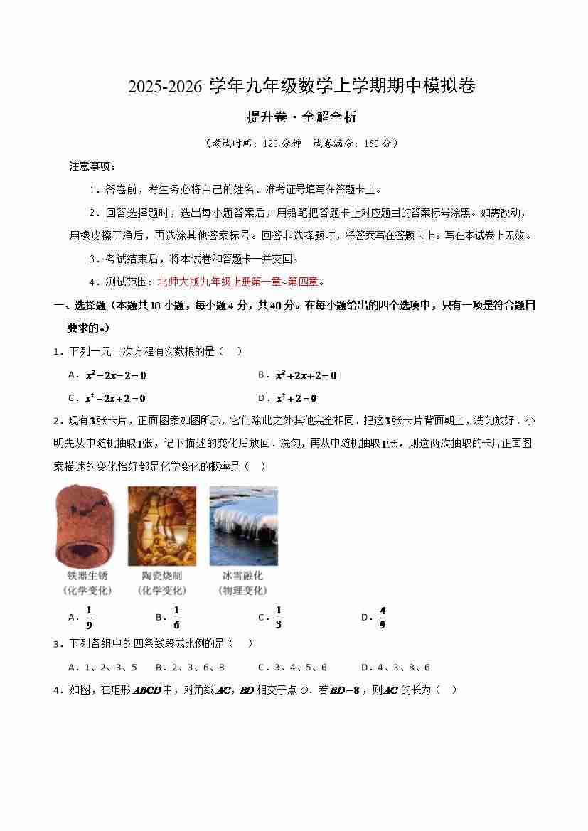 九上数学:【北师】期中模拟卷02【范围:1-5章】