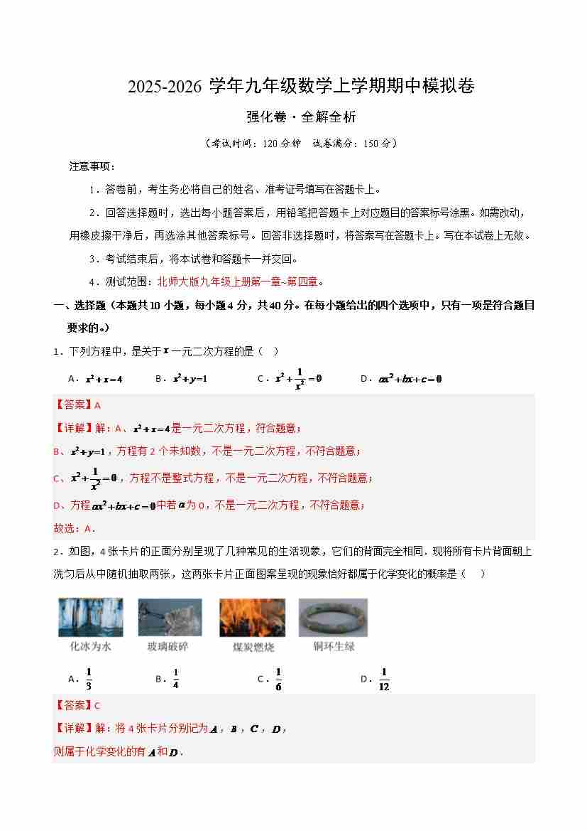 九年级数学上学期期中模拟卷(北师大版,高效培优强化卷)(全解全析)