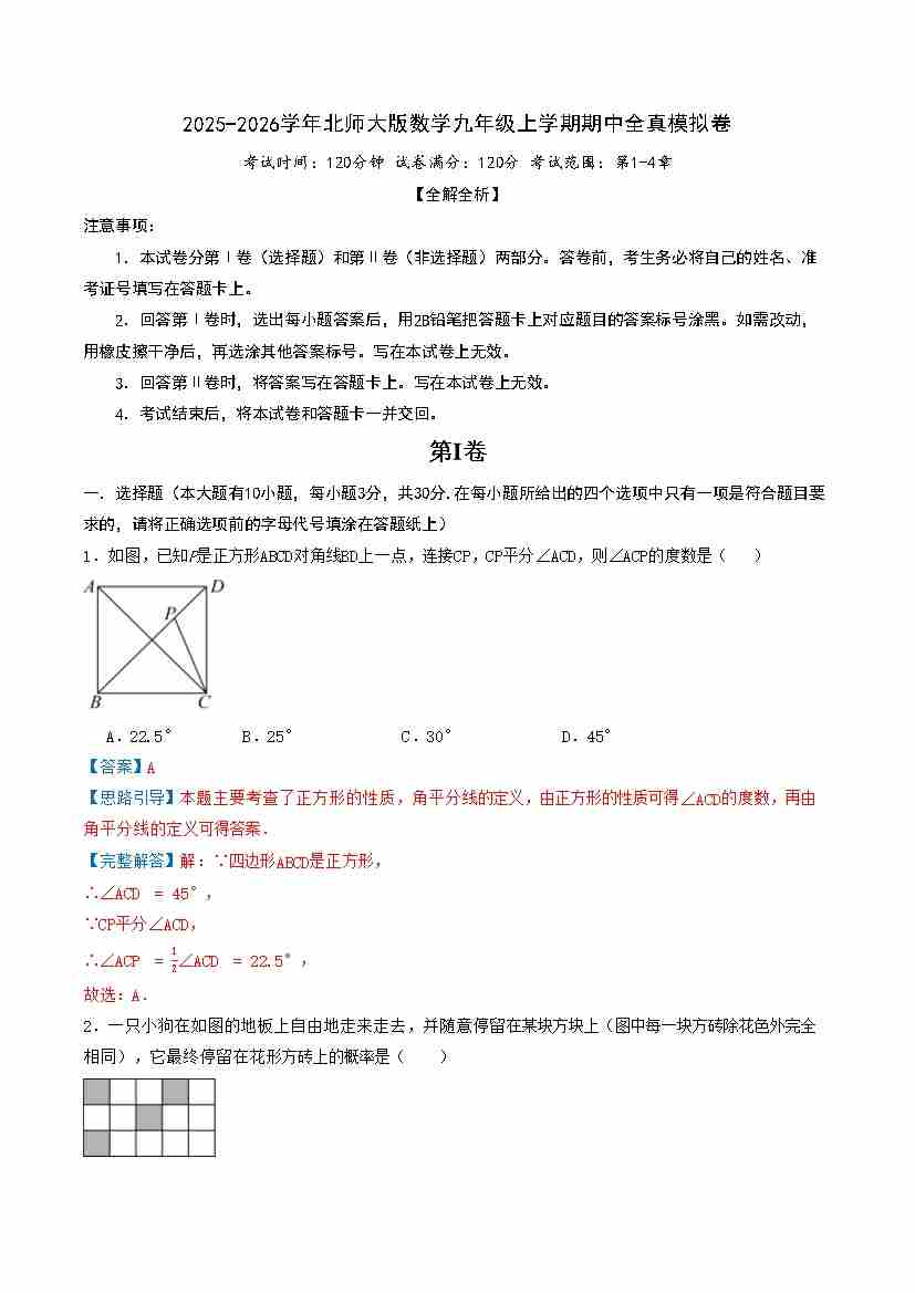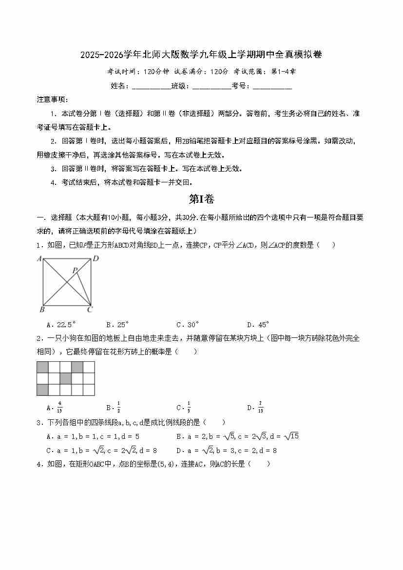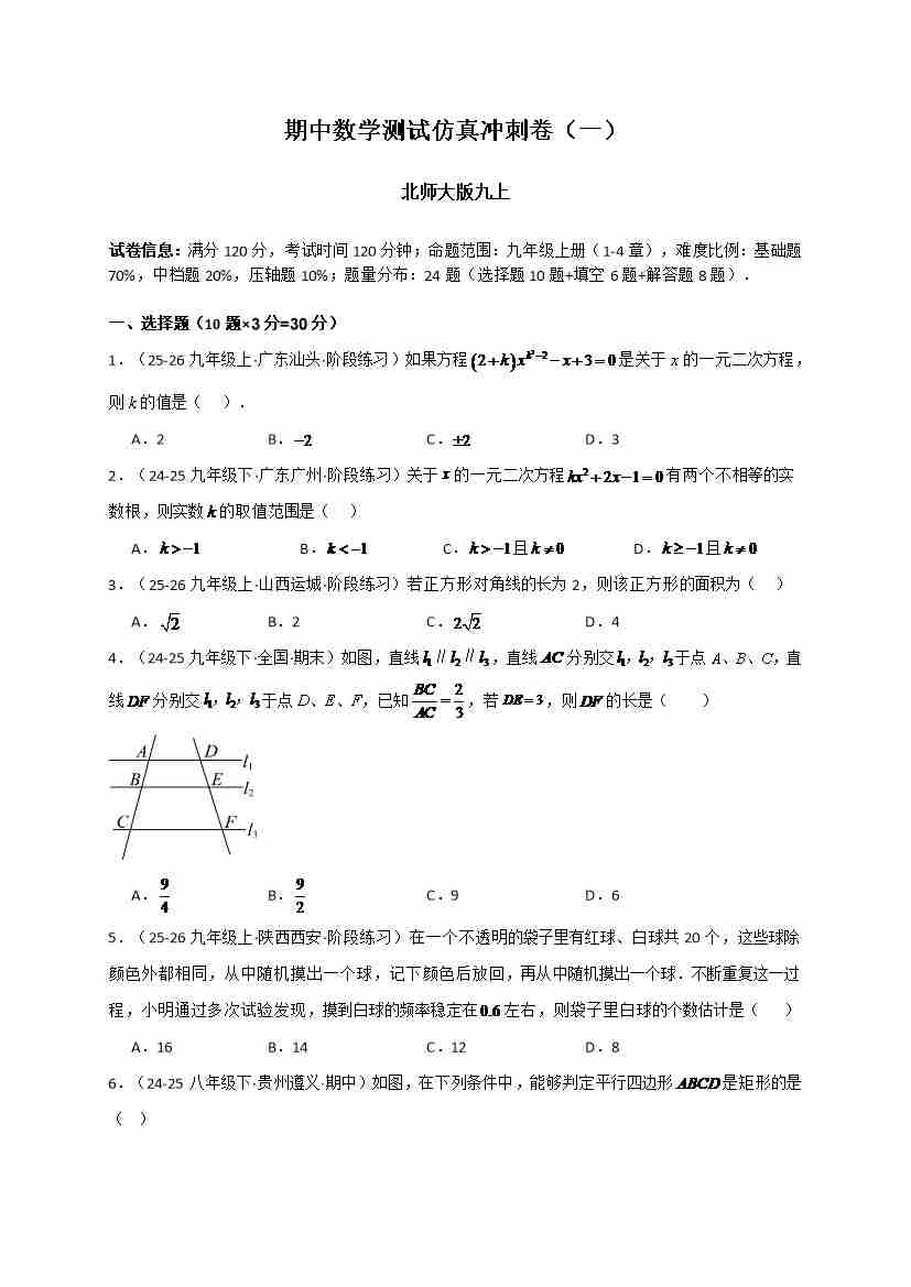 九上数学:【北师】期中模拟卷01【范围:1-5章】