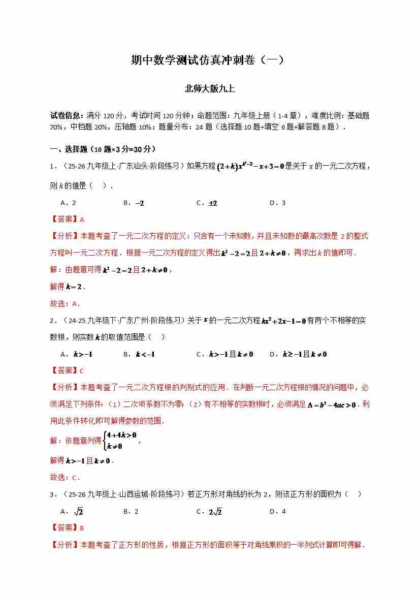 期中数学测试仿真冲刺卷(一)-(北师大版 )(教师版)