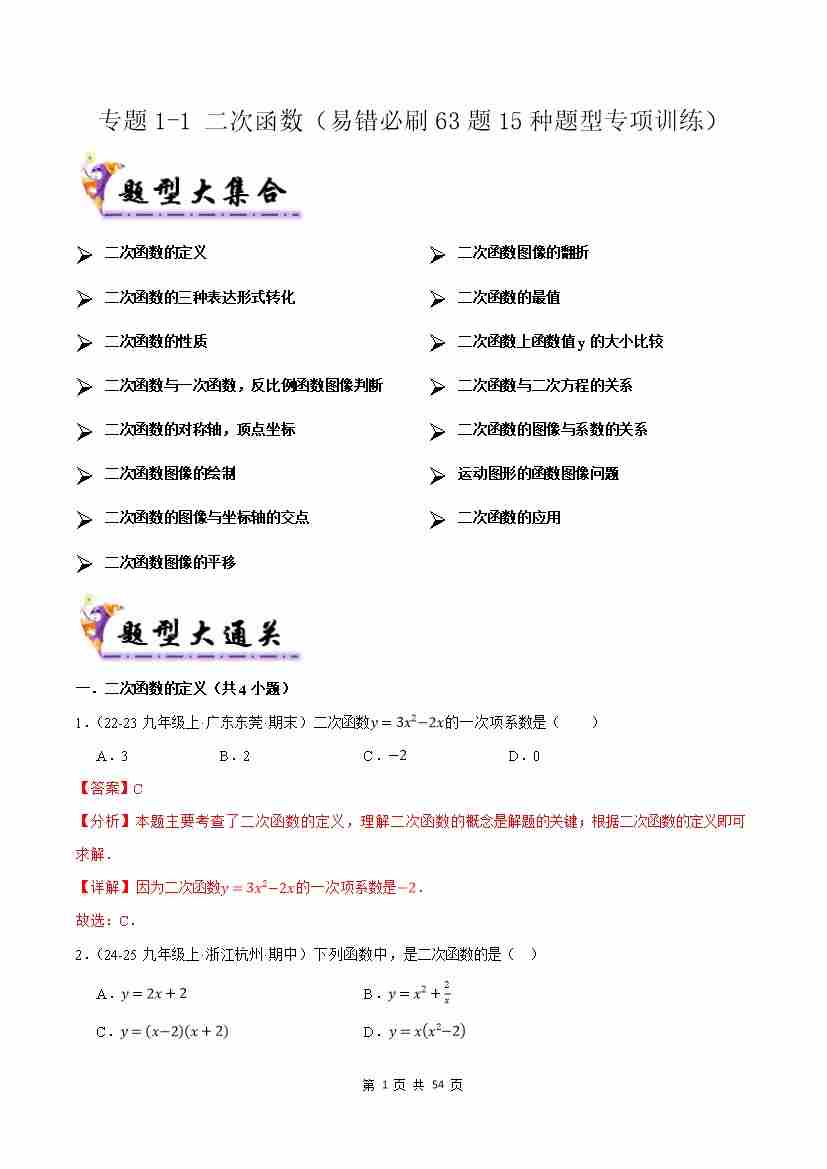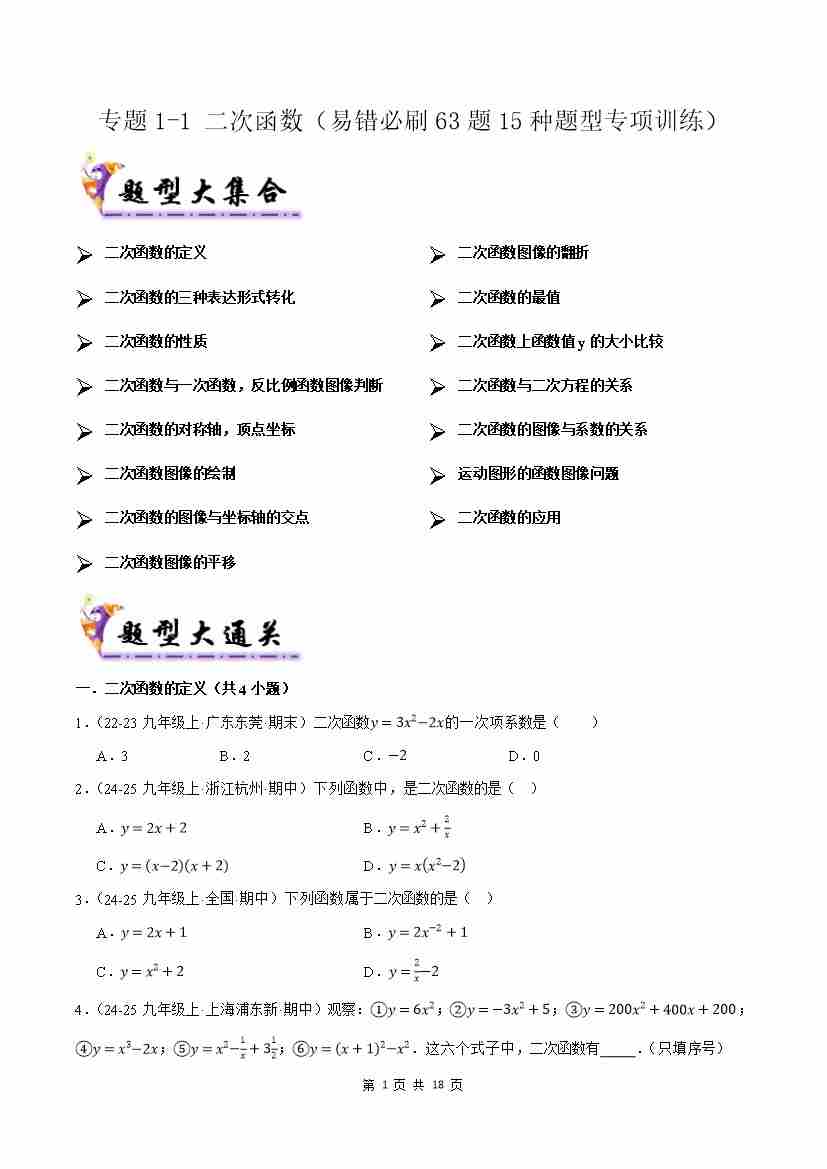 专题1-1二次函数(考题猜想63题15种题型)(原题版)