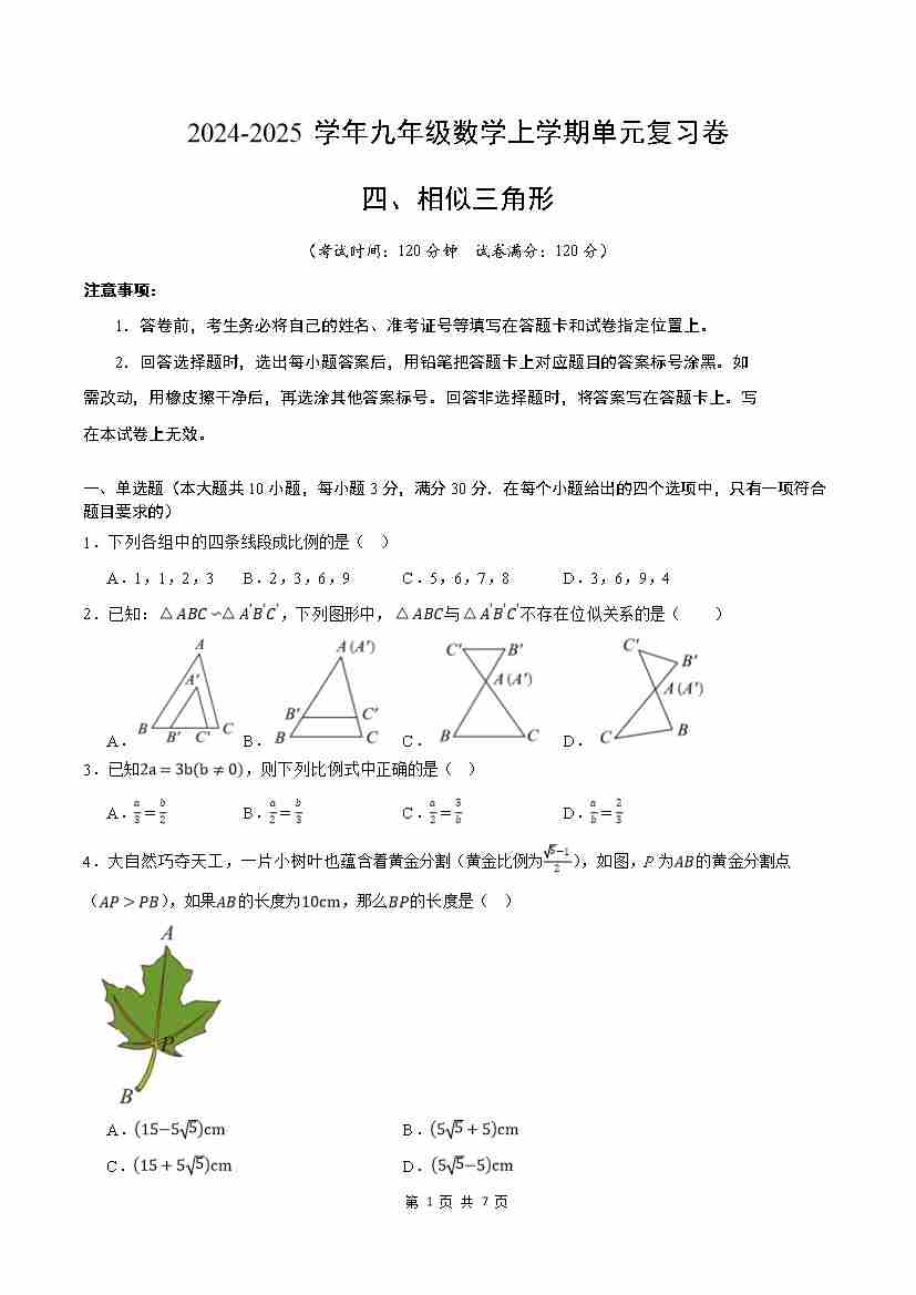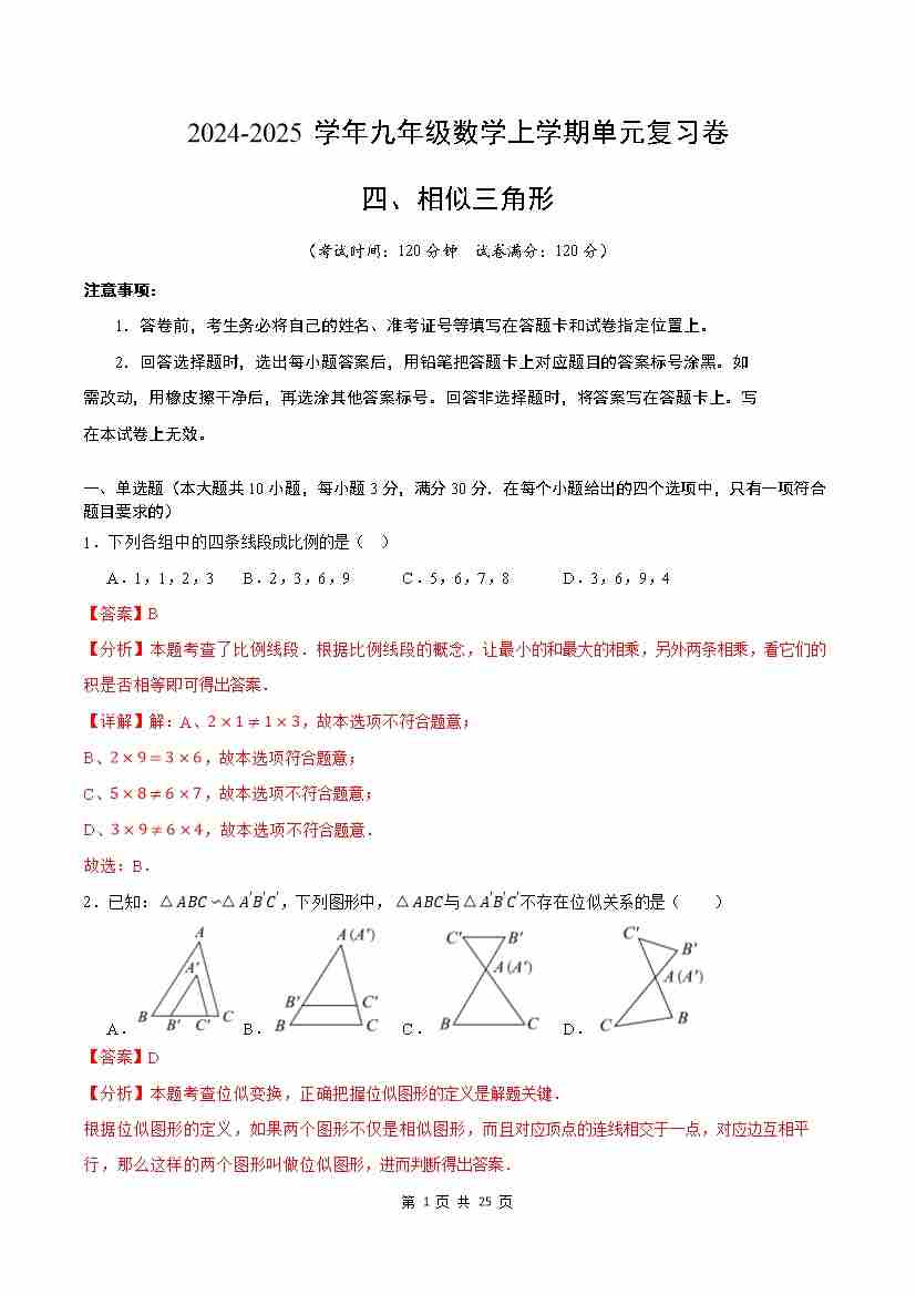 浙教版九年级期末大串讲单元复习卷4相似三角形(原题版)