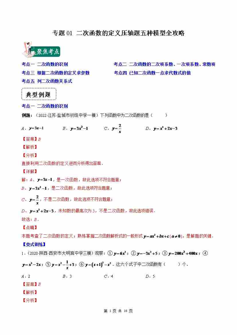 专题01 二次函数的定义压轴题五种模型全攻略(解析版)-【压轴必考】2022-2023学年九年级数学上册压轴题攻略(浙教版)