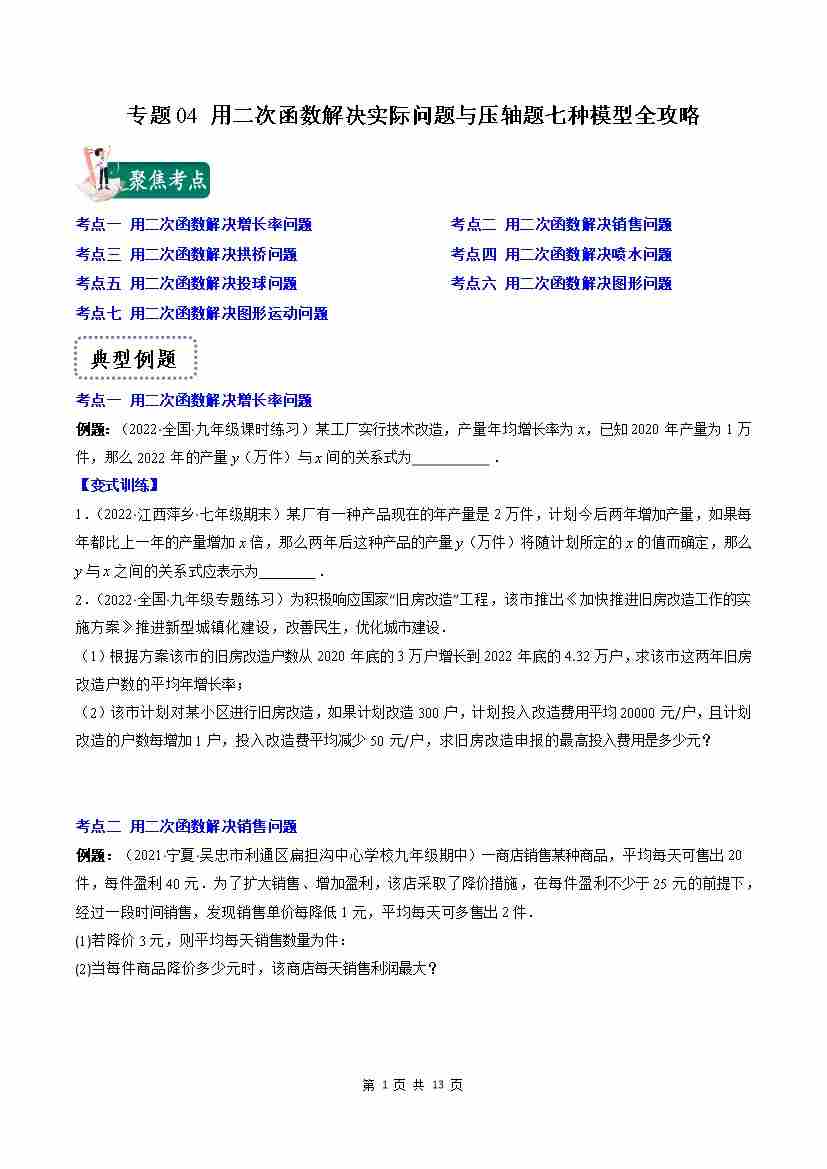 专题04 用二次函数解决实际问题与压轴题七种模型全攻略(原卷版)--【压轴必考】2022-2023学年九年级数学上册压轴题攻略(浙教版)