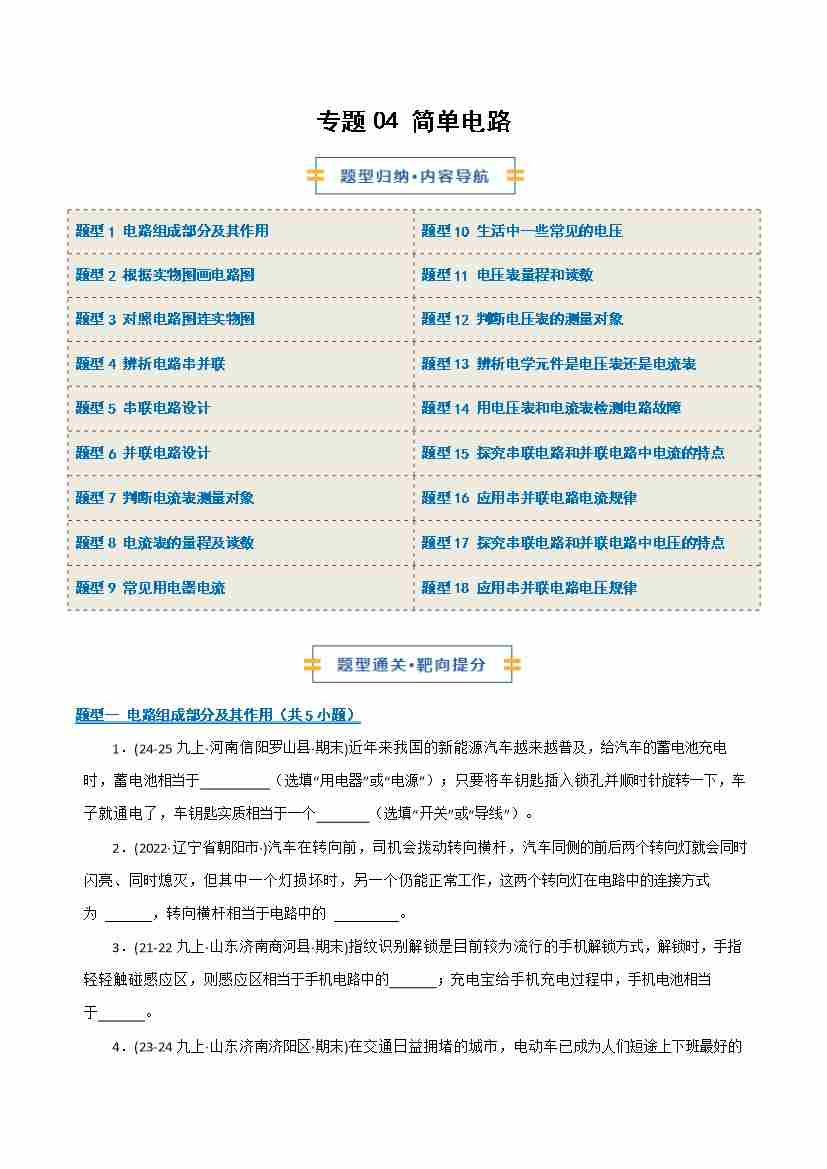 专题04 简单电路(期末专项训练)(原卷版)