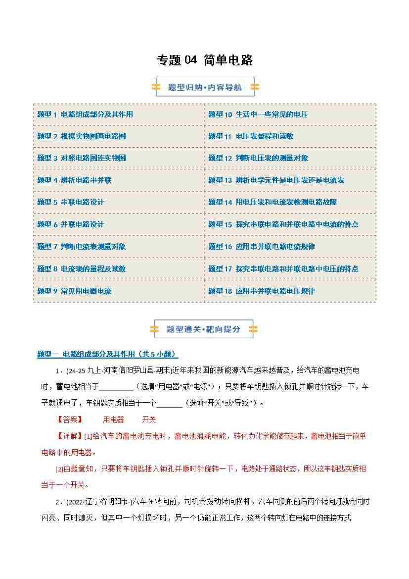 专题04 简单电路(期末专项训练)(解析版)