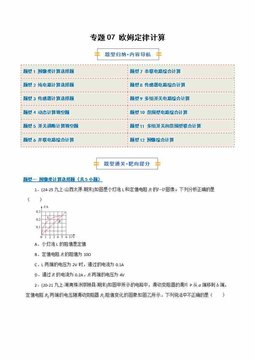 专题07 欧姆定律计算(期末专项训练)(原卷版)