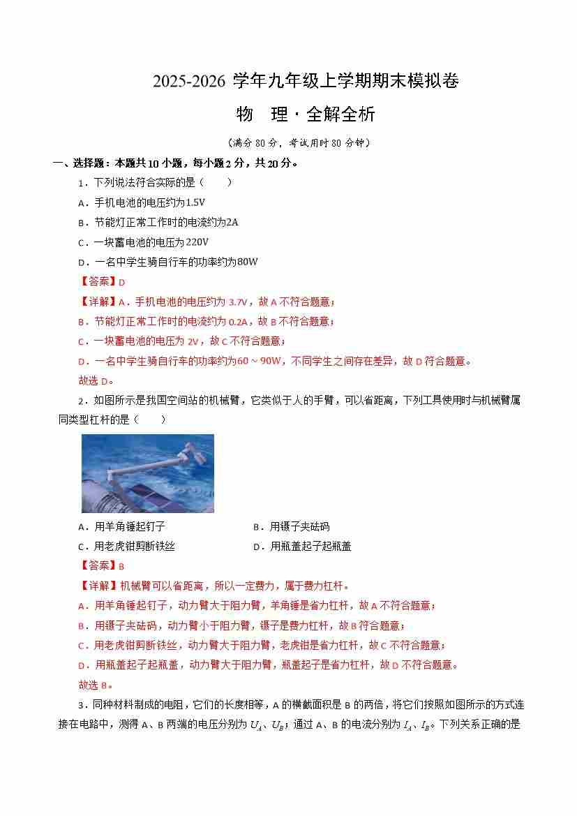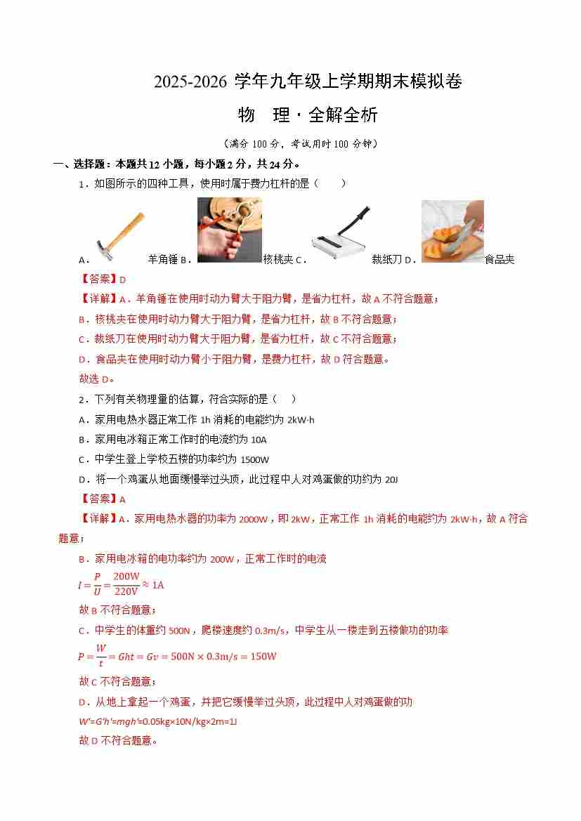 九年级物理上学期期末模拟卷(2)(苏科版)(全解全析)2025-2026版