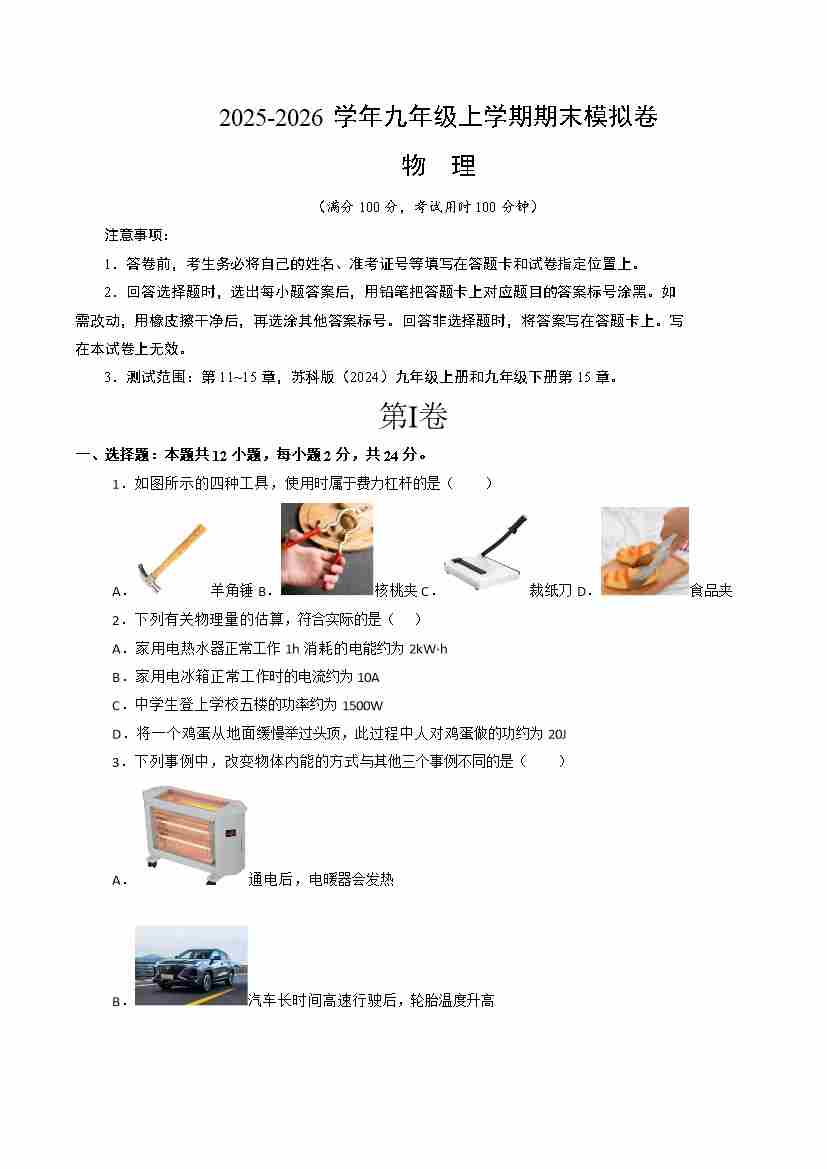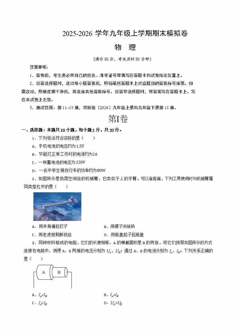 九年级物理上学期期末模拟卷(2)(苏科版)(考试版A4)2025-2026版