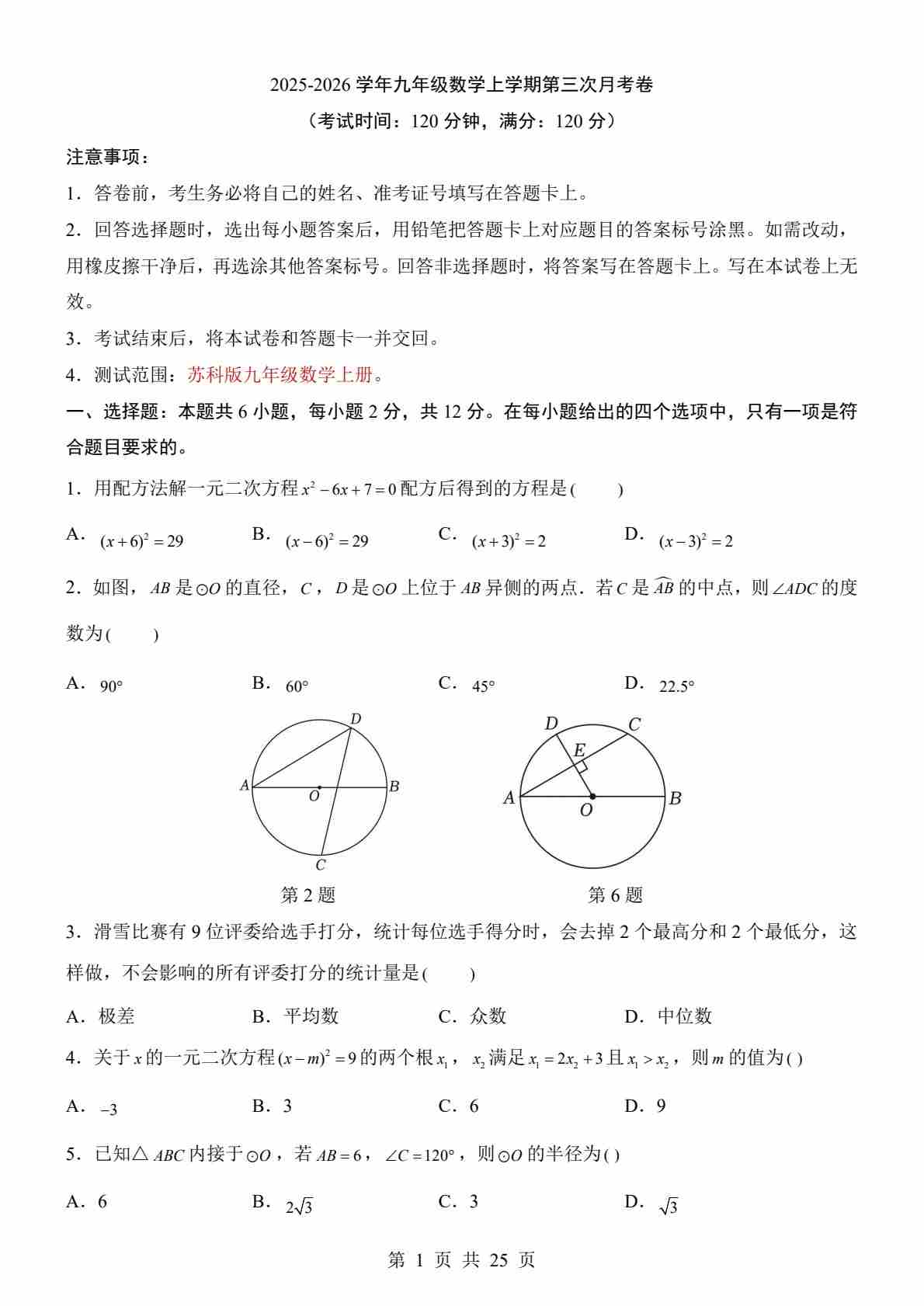 【苏科】9上数学第3次月考【第1-4章】25秋