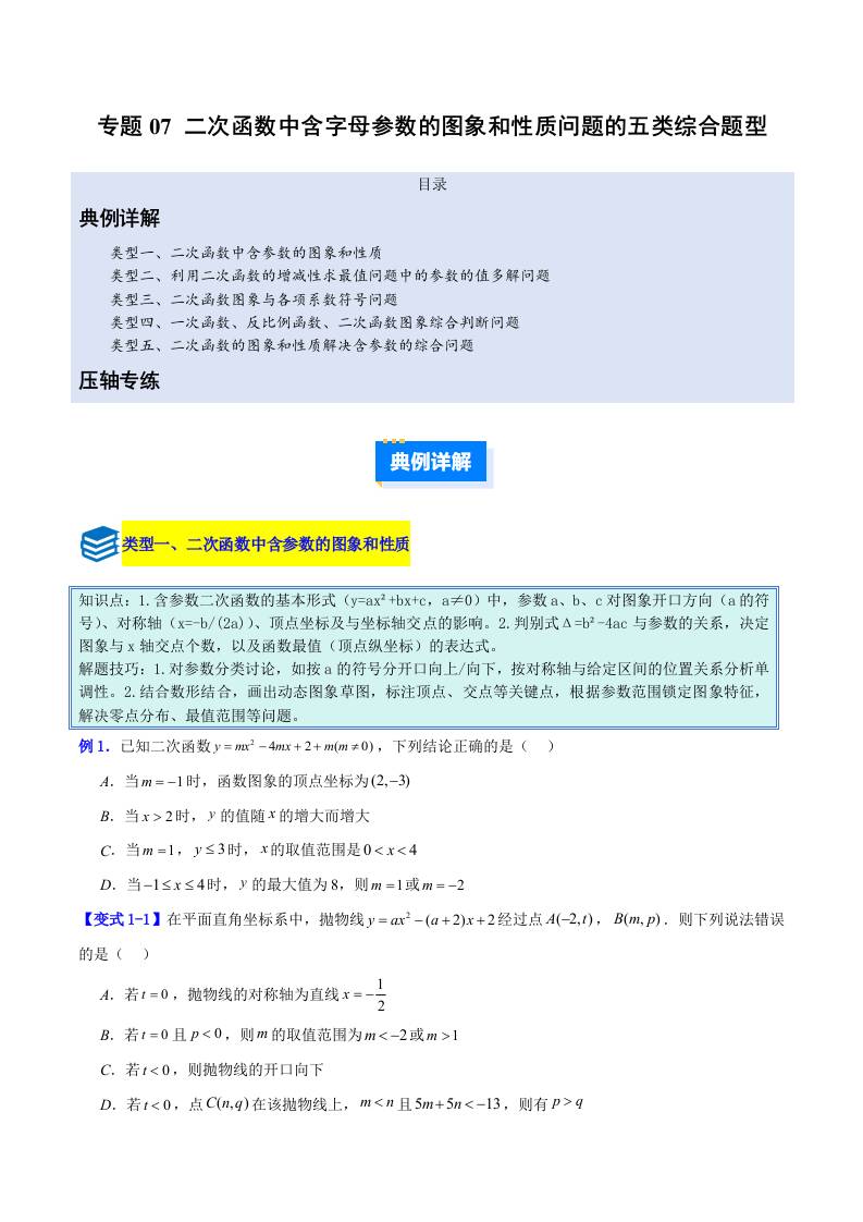 专题07 二次函数中含字母参数的图象和性质问题的五类综合题型(压轴题专项训练) (学生版)