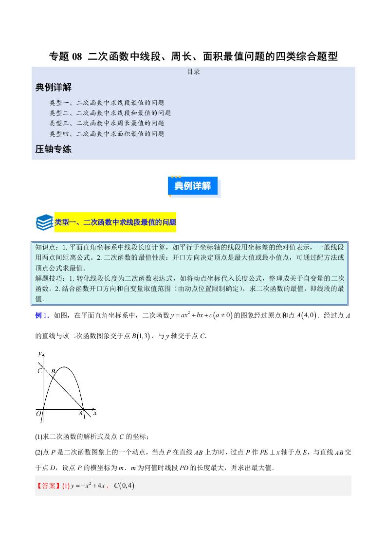 专题08 二次函数中线段、周长、面积最值问题的四类综合题型(压轴题专项训练) (学生版)