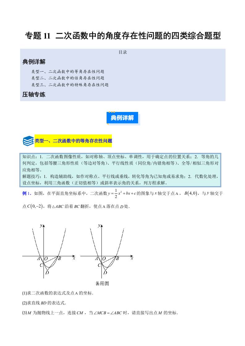 专题11 二次函数中的角度存在性问题的四类综合题型(压轴题专项训练) (学生版)
