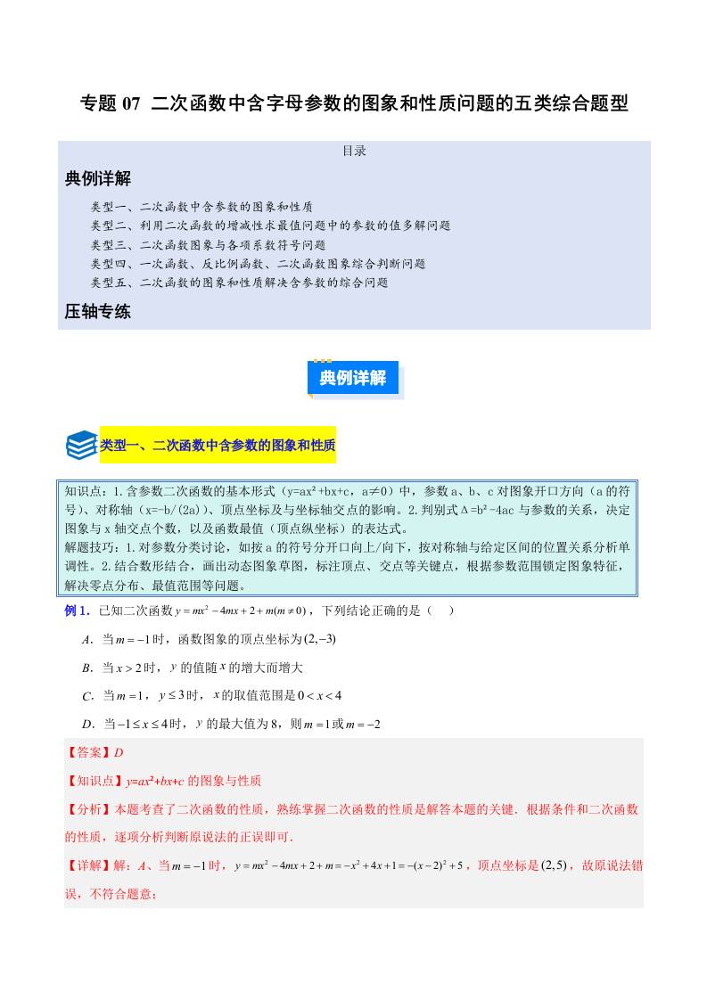 专题07 二次函数中含字母参数的图象和性质问题的五类综合题型(压轴题专项训练) (教师版)