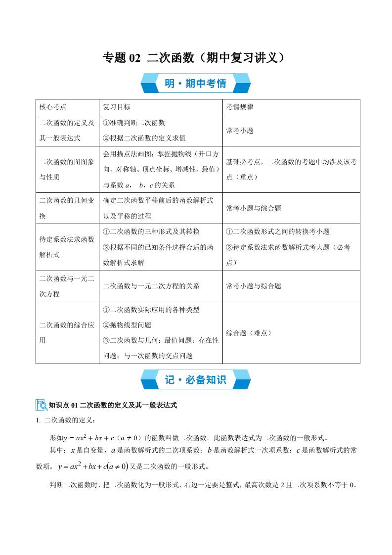专题02 二次函数(期中复习讲义)(学生版)
