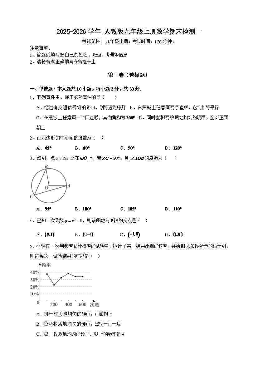 九上数学期末检测(含解析)2025-2026学年 人教版