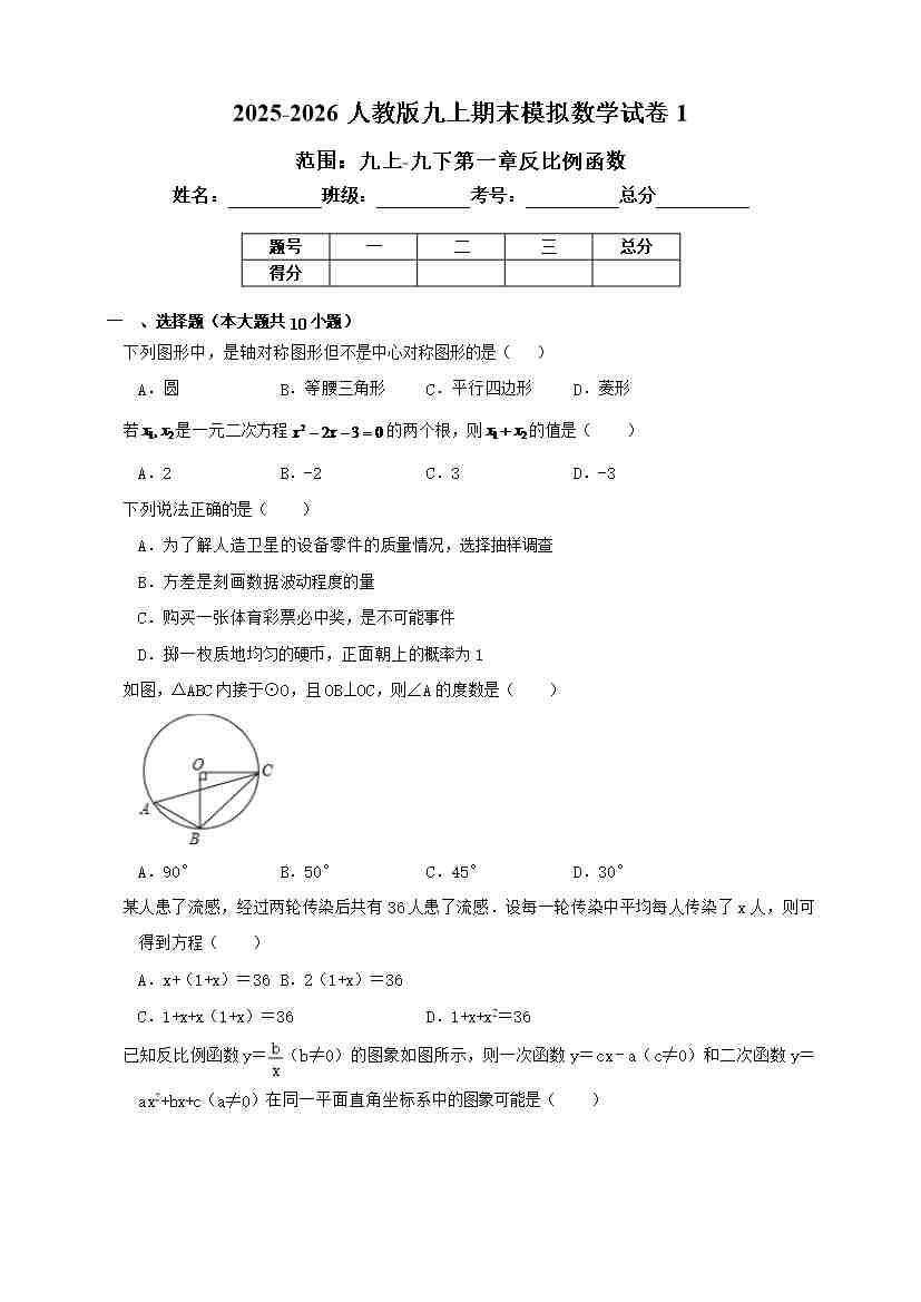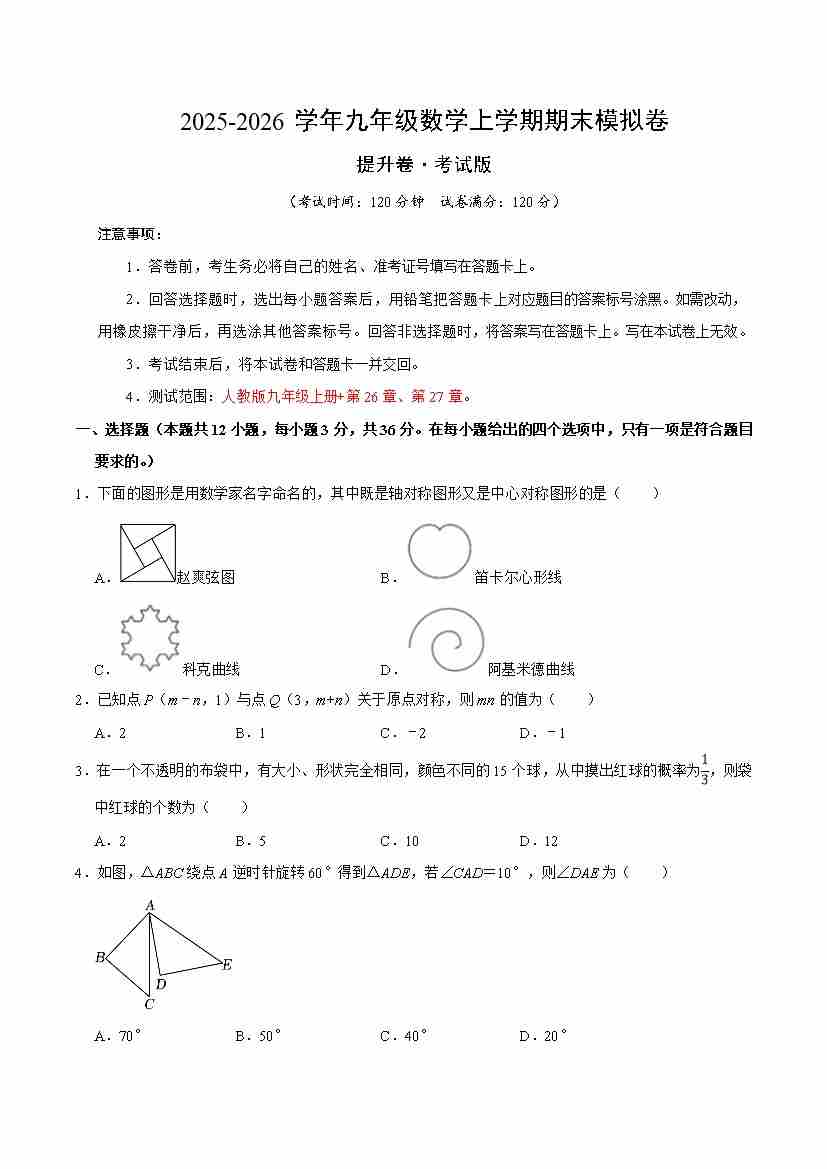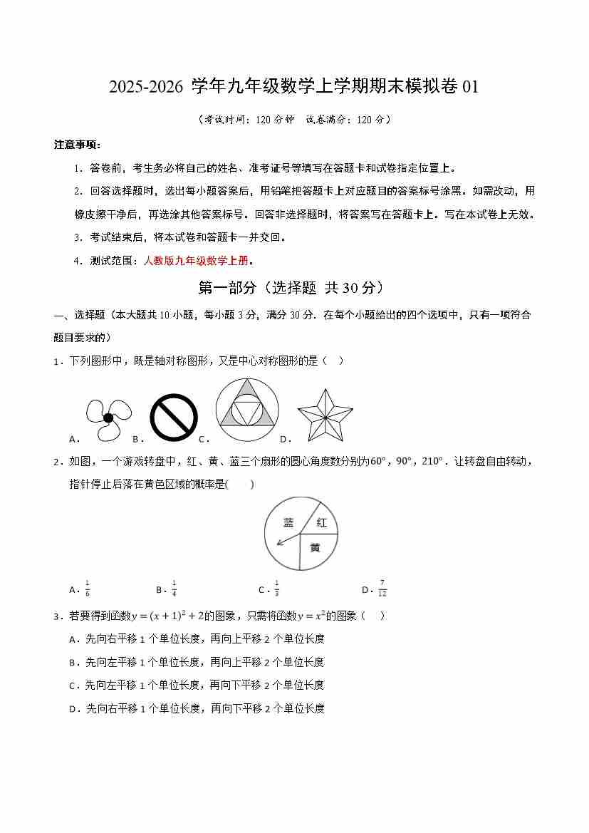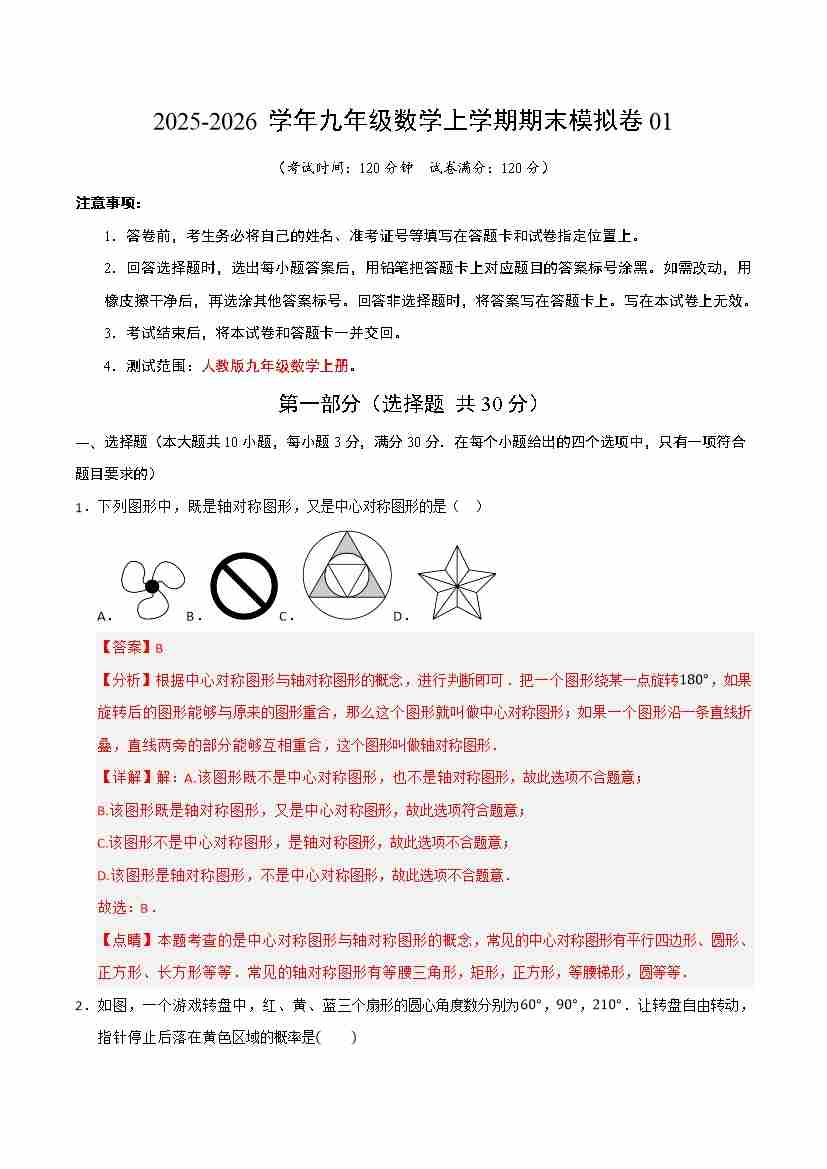 九上期末模拟数学试卷1(含解析)2025-2026人教版