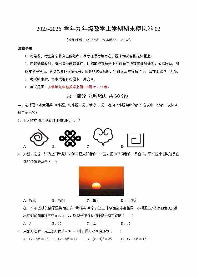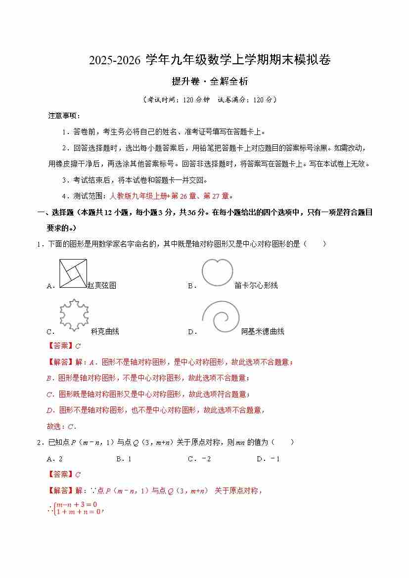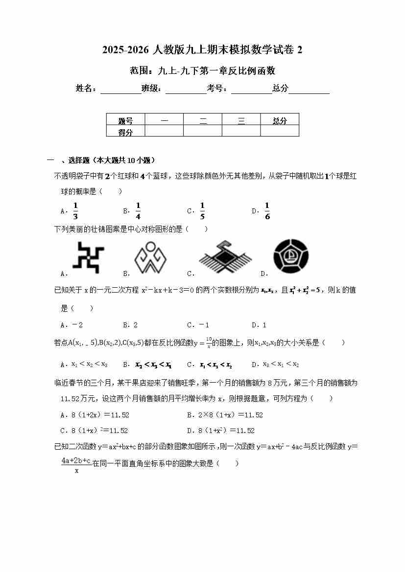 九上期末模拟数学试卷2(含解析)2025-2026人教版