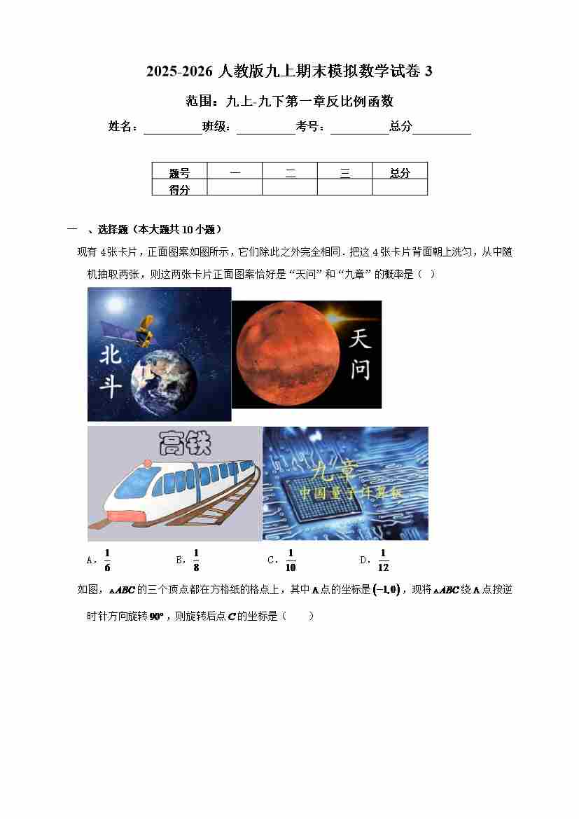 九上期末模拟数学试卷3(含解析)2025-2026人教版