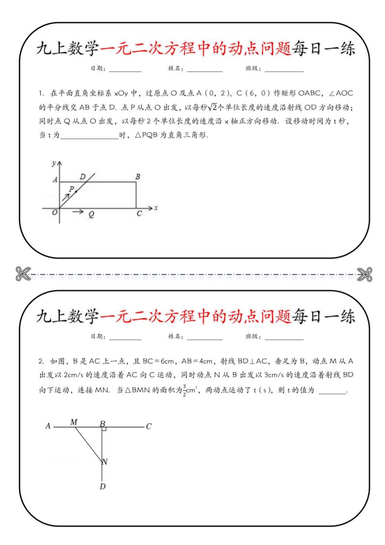 九上数学一元二次方程中的动点问题每日一练【空白】