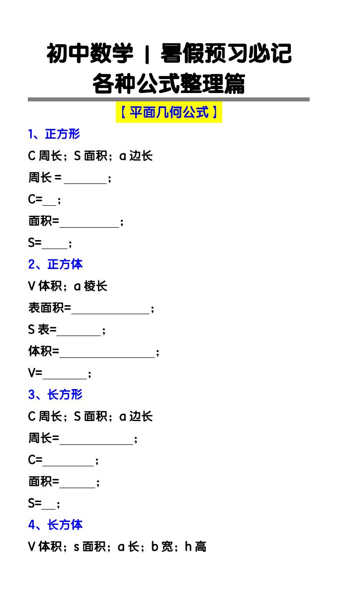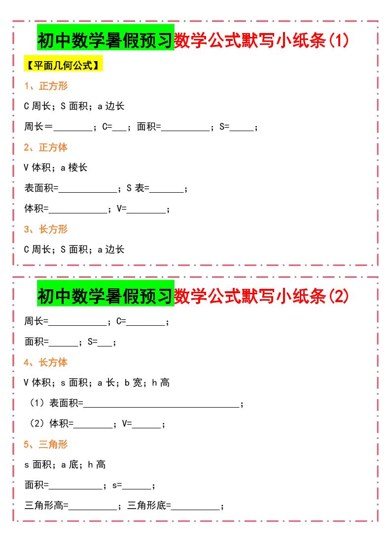 初中数学暑假预习数学公式默写小纸条