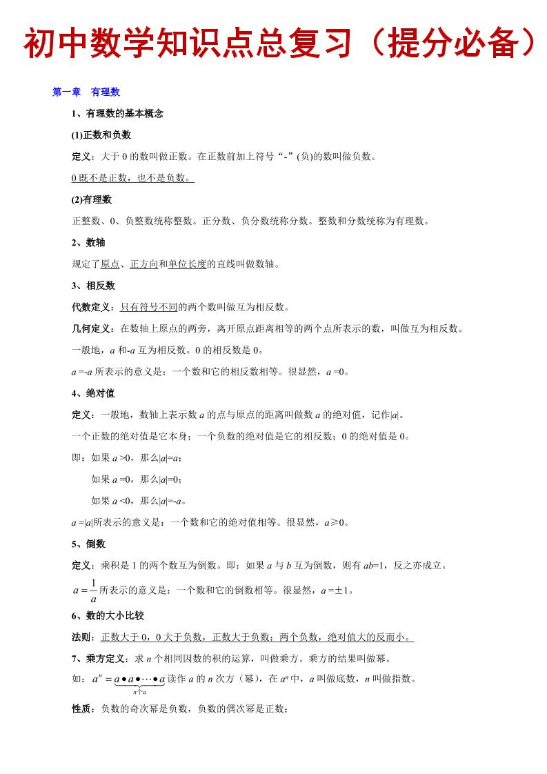 初中数学知识点总复习(提分必备)