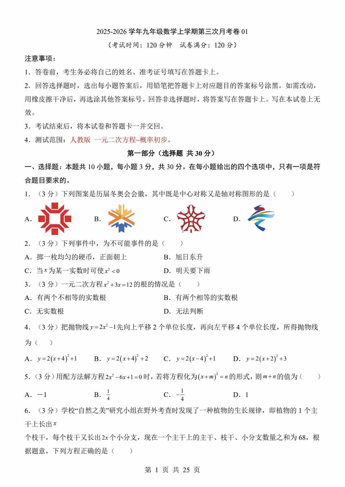 【人教】9上数学第3次月考01【第21-25章】25秋