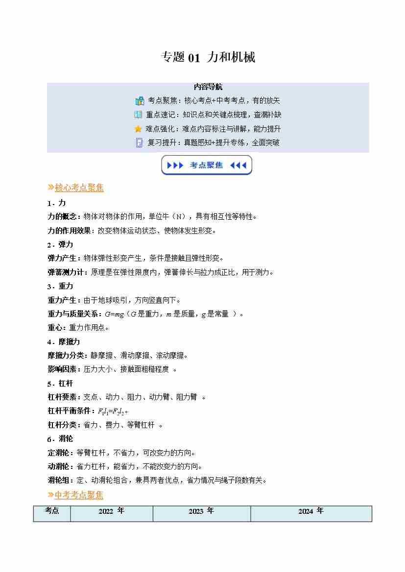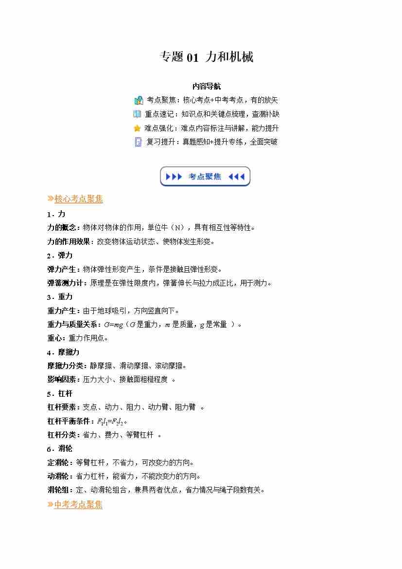 专题01 力和机械(复习)(原卷版)