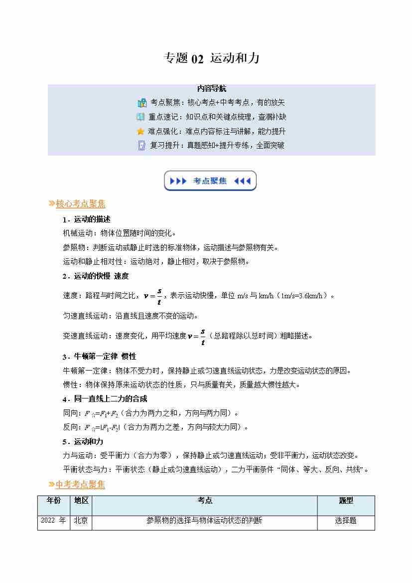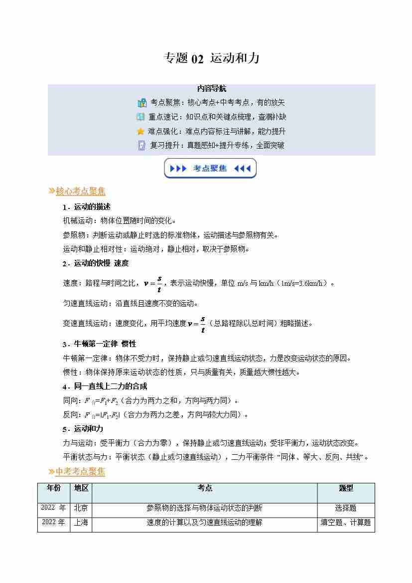 专题02 运动和力(复习)(原卷版)