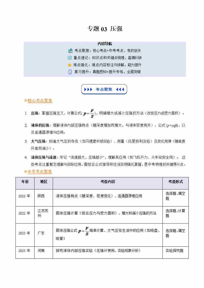 专题03 压强(复习)(原卷版)