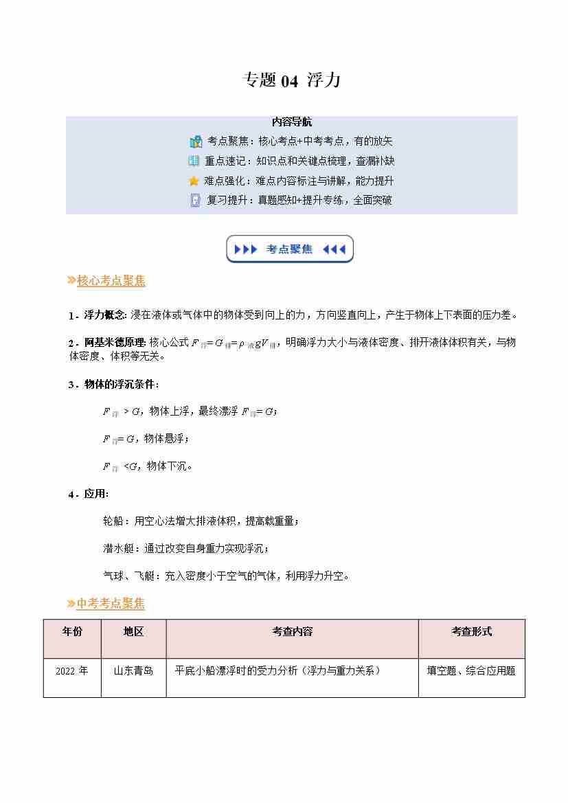 专题04 浮力(复习)(原卷版)