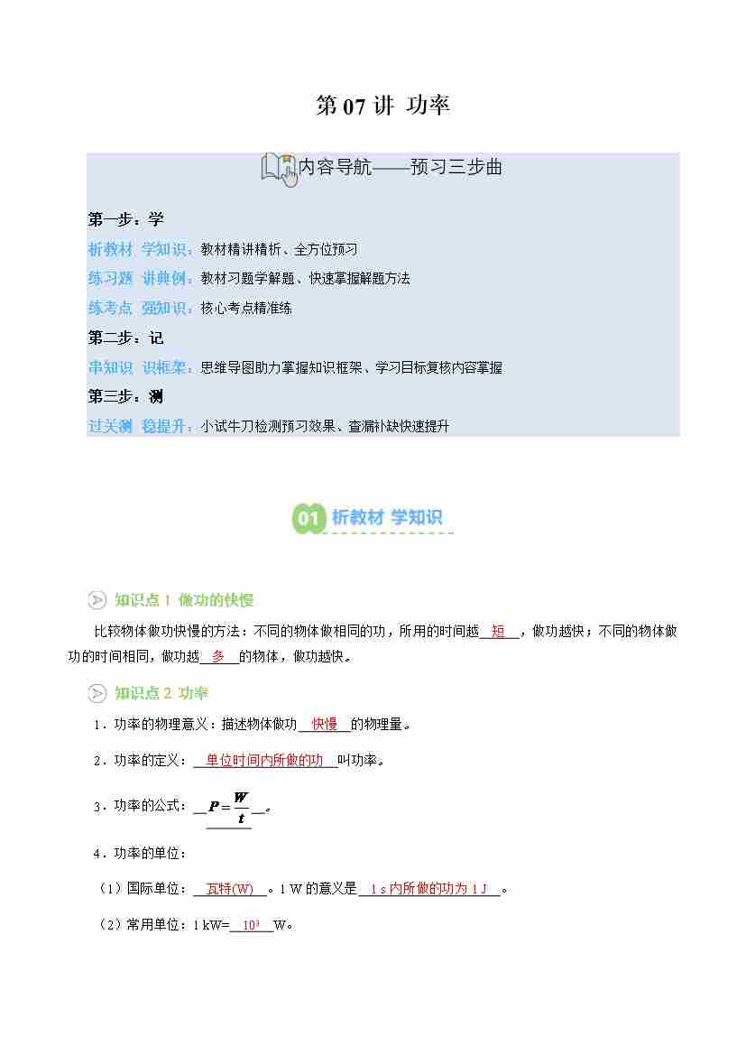 专题07 功率(预习)(解析版)