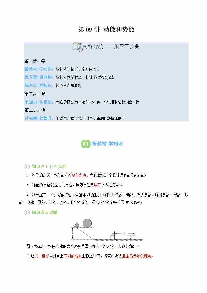 专题09 动能和势能(预习)(解析版)