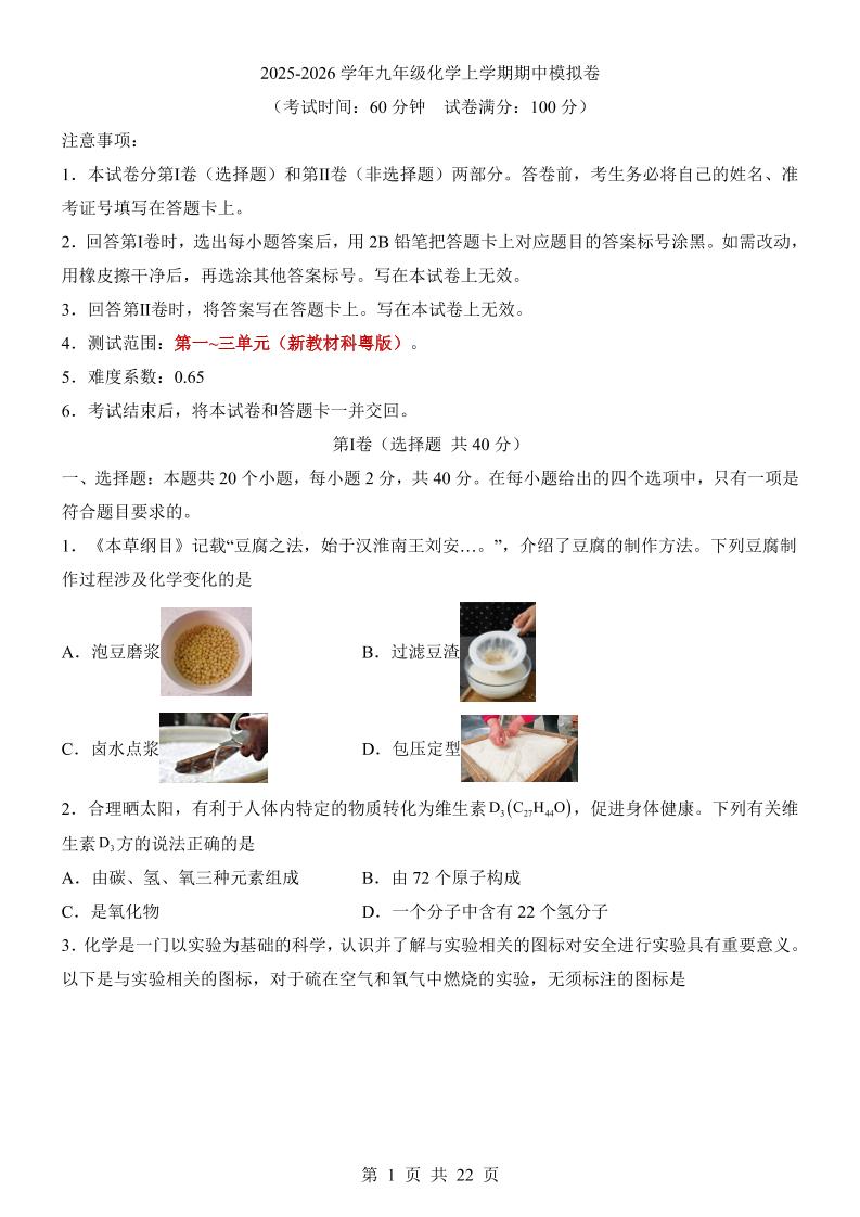 【科粤】9上化学期中卷【第1-3单元】