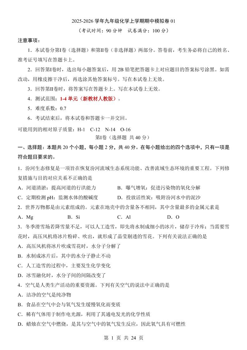 九年级化学期中模拟卷01【测试范围:1~5单元】(人教版2024)(考试版A4)