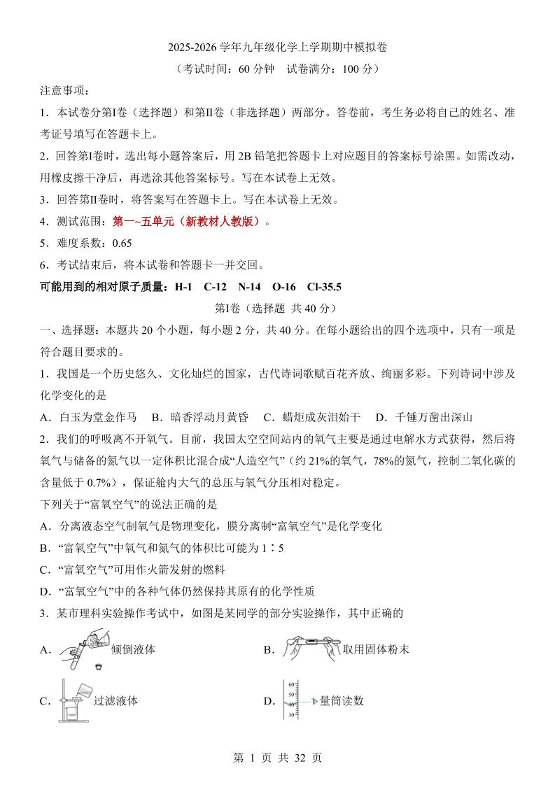 【人教】9上化学期中卷01【第1-5单元】