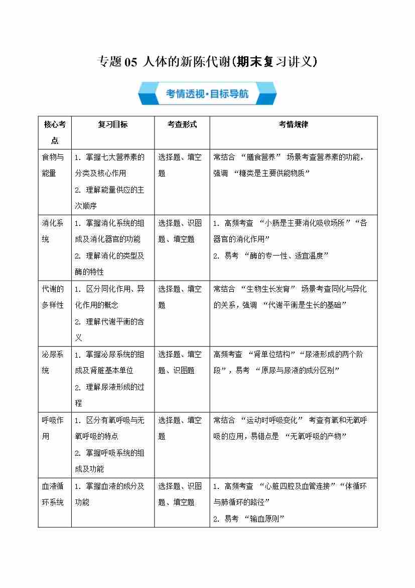 专题05 人体的新陈代谢(期末复习讲义)(原卷版)
