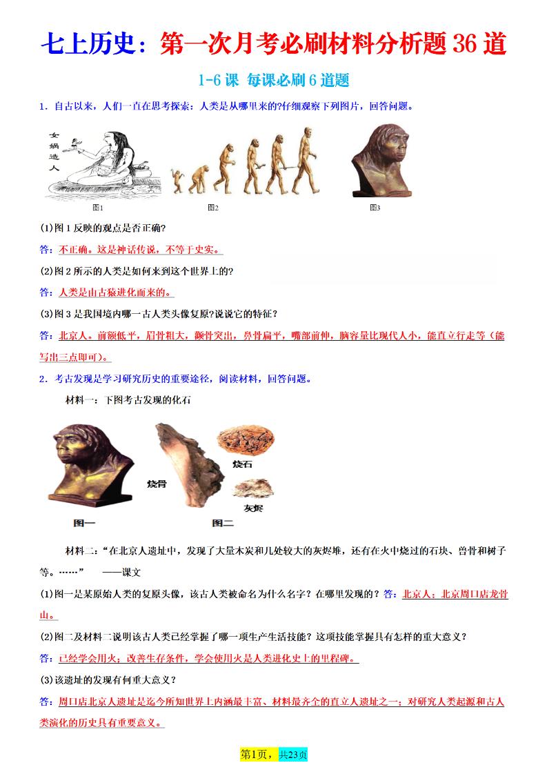 七上历史第一次月考必刷材料分析题36道(背诵版)...