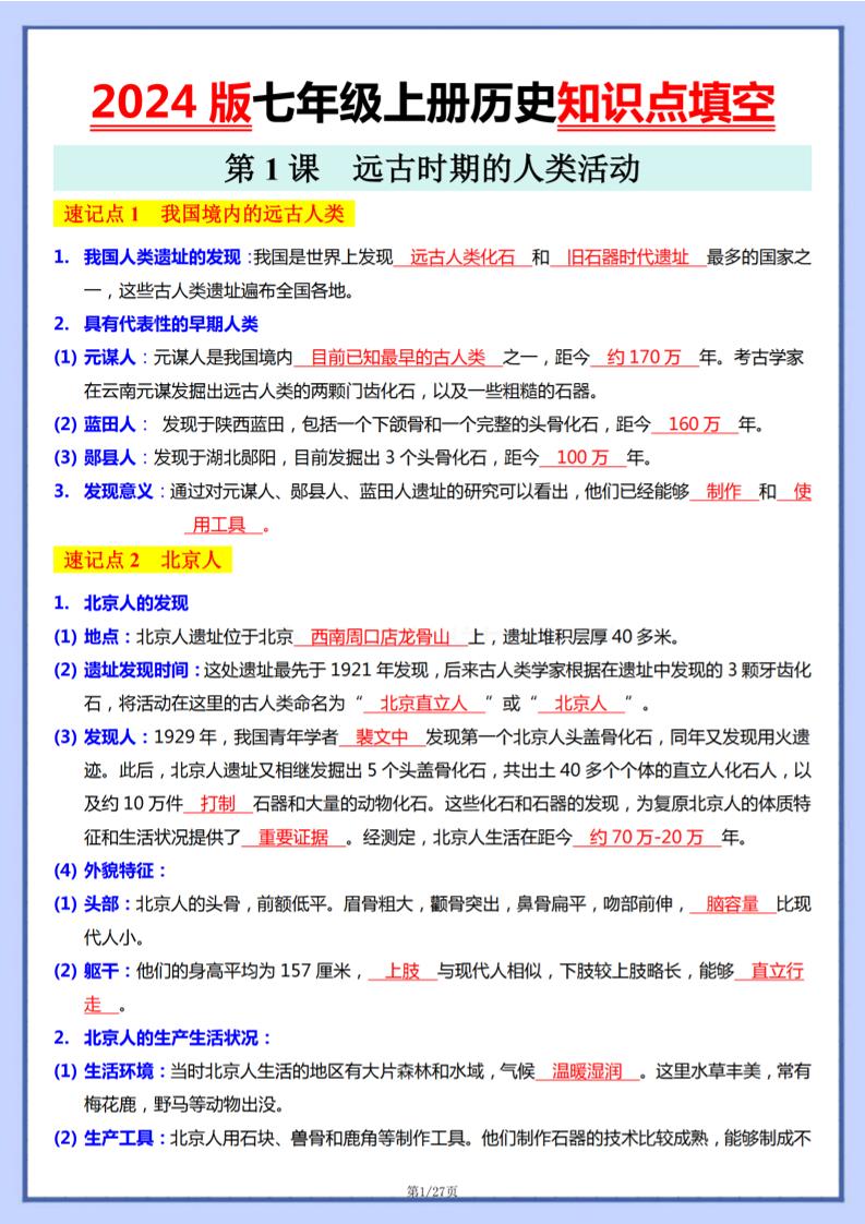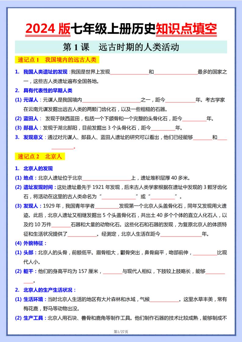 2024版七上历史知识点(填空).
