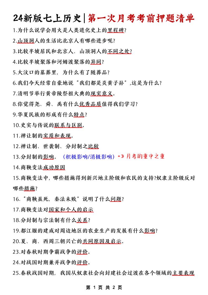 24新版七上历史押题清单