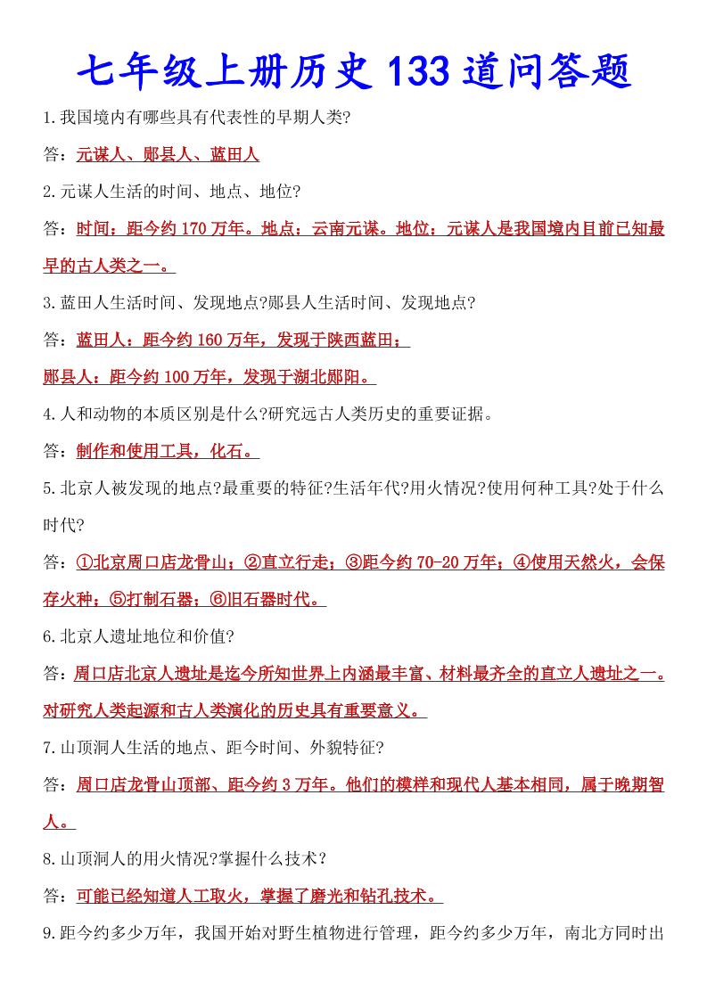 七年级上册历史133道问答题.