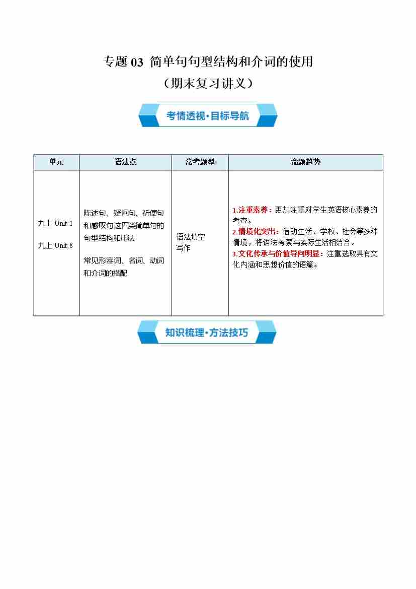 专题03 简单句句型结构和介词的使用(期末复习讲义)(原卷版)