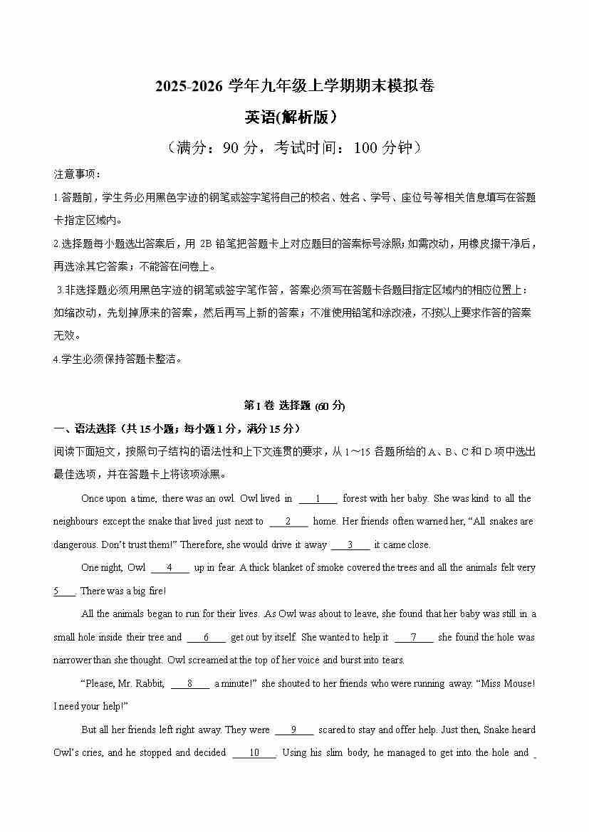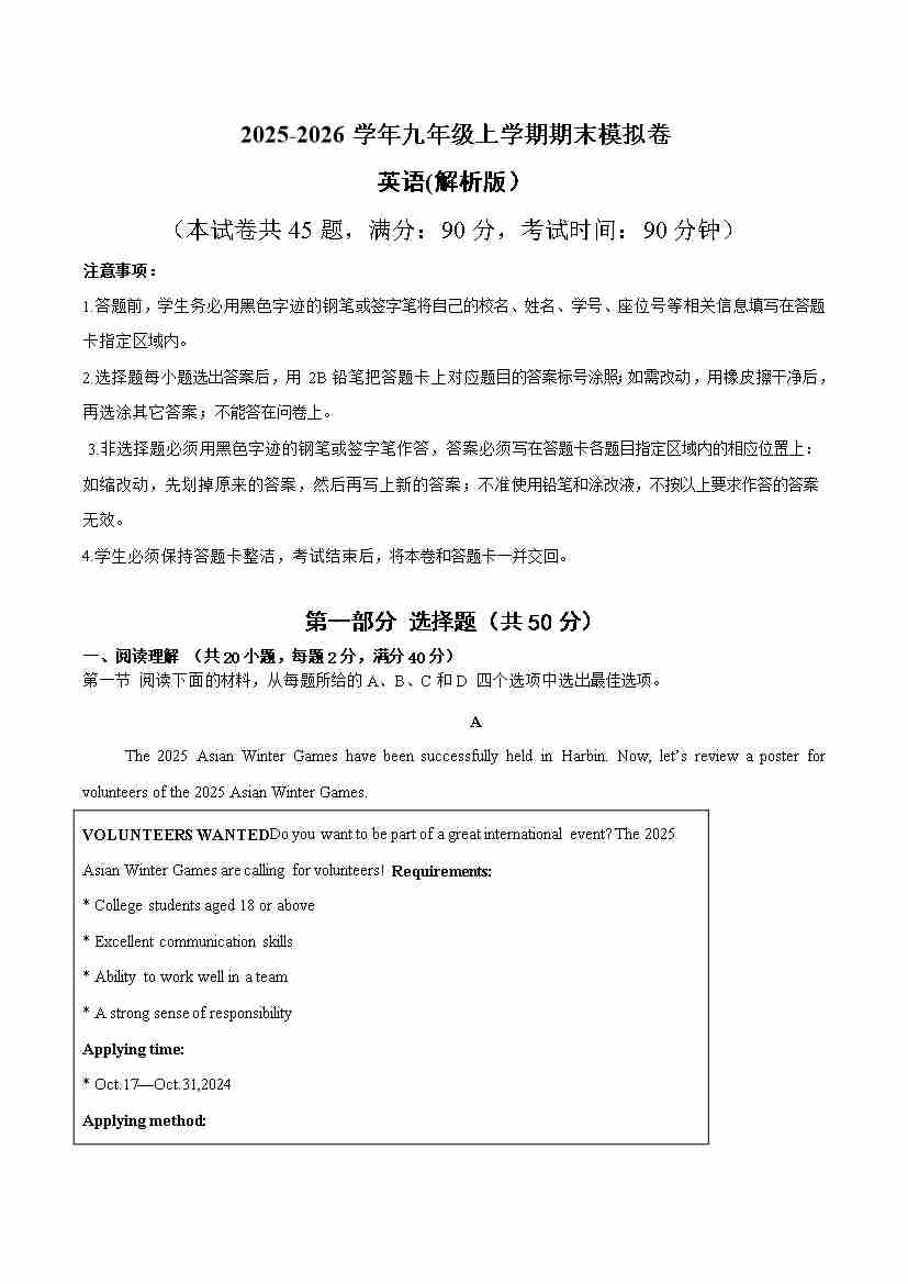 九年级英语上学期期末模拟卷(沪教版)(试卷版A4)