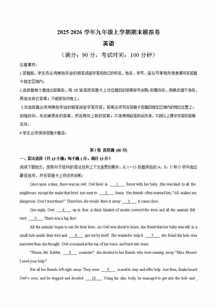 九年级英语上学期期末模拟卷(沪教牛津版,沈阳专用)(A4版)