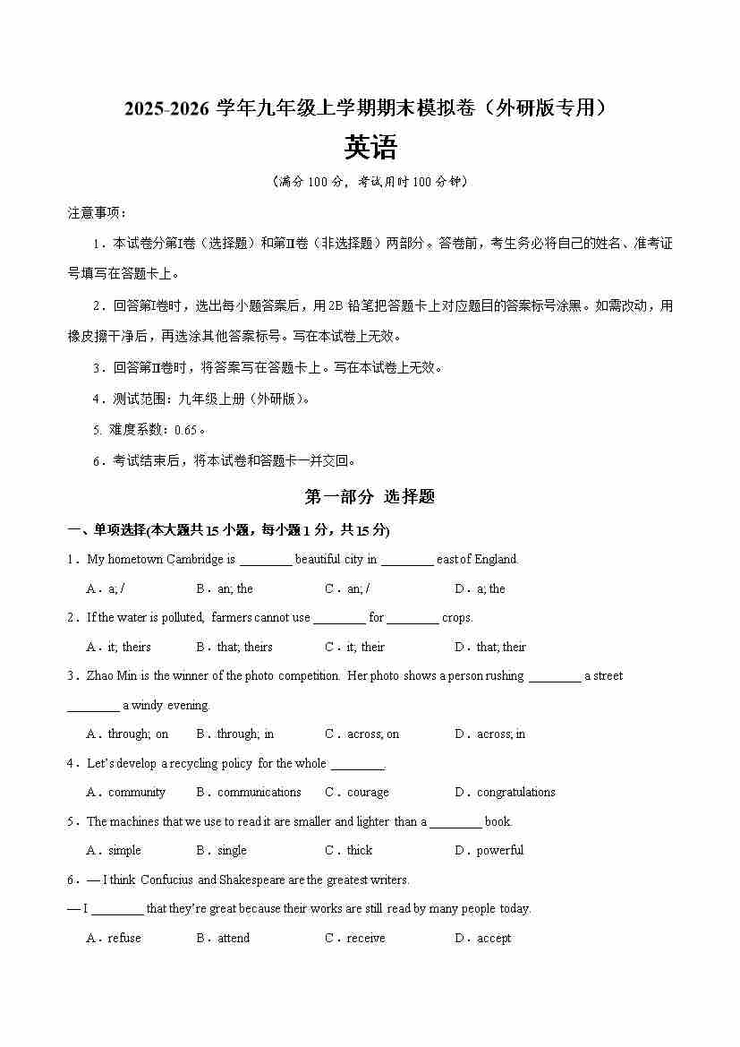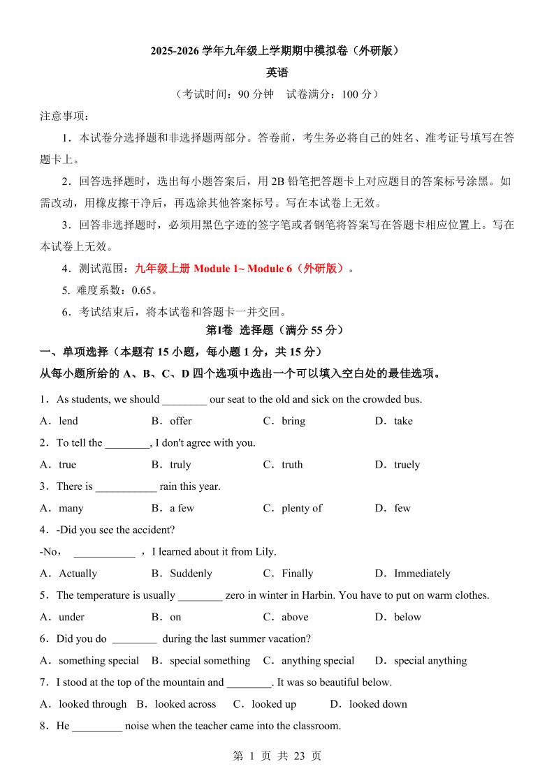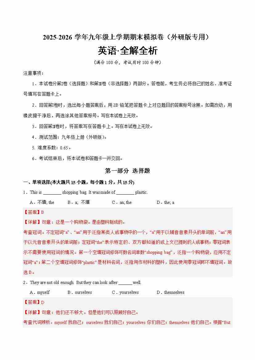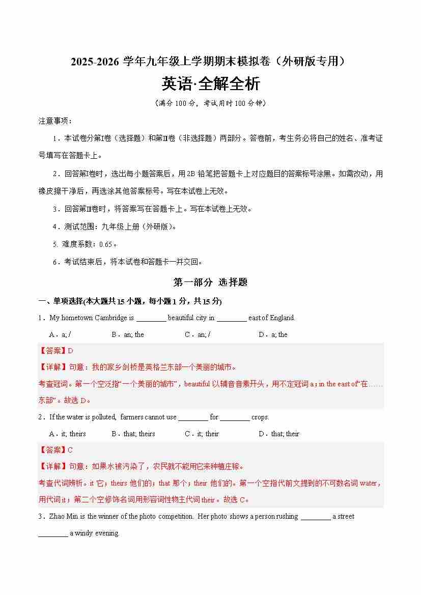 九年级英语上学期期末模拟卷01(外研版专用)(教师版)