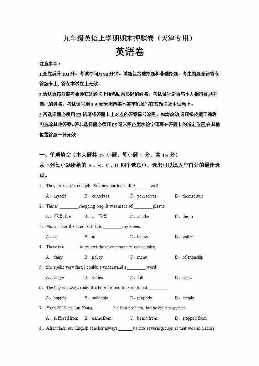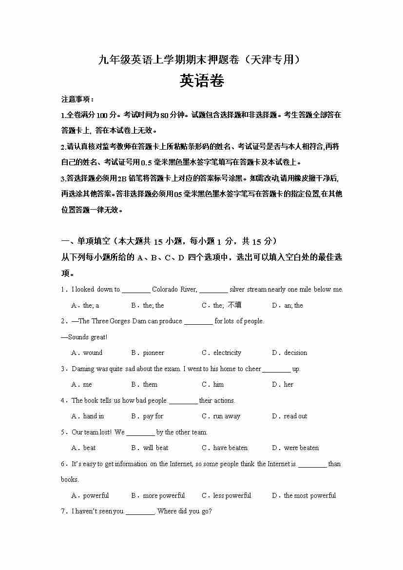 九年级英语上学期期末名校押题卷(天津专用)(原卷版)