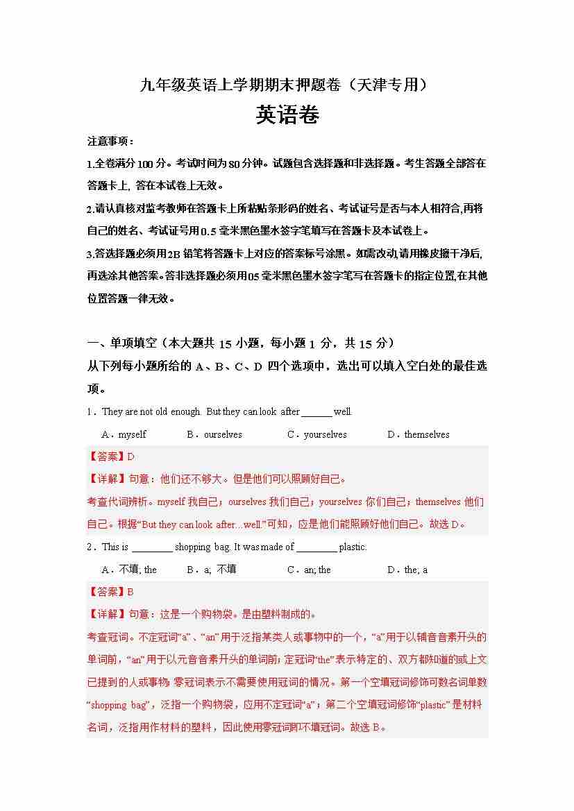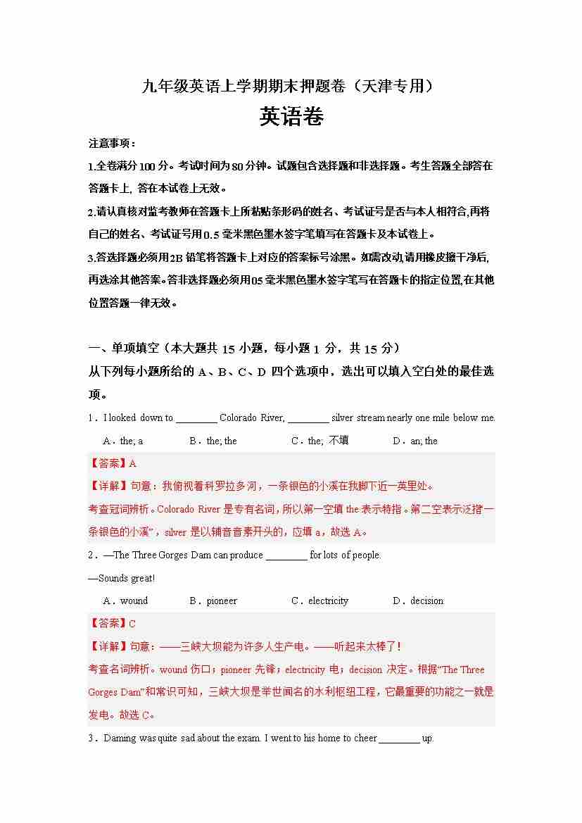 九年级英语上学期期末名校押题卷(天津专用)(解析版)