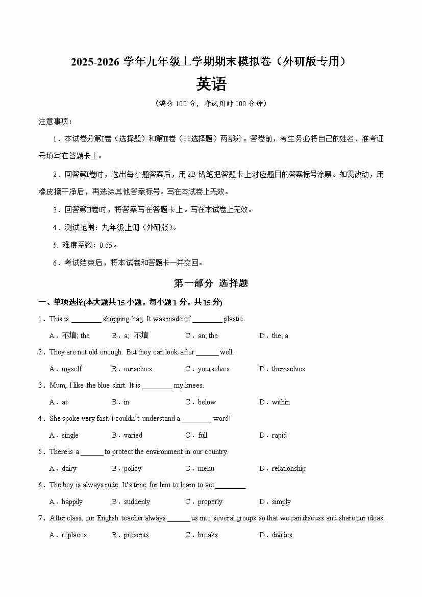 九年级英语上学期期末模拟卷01(外研版专用)(考试版A4)